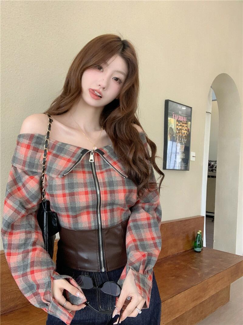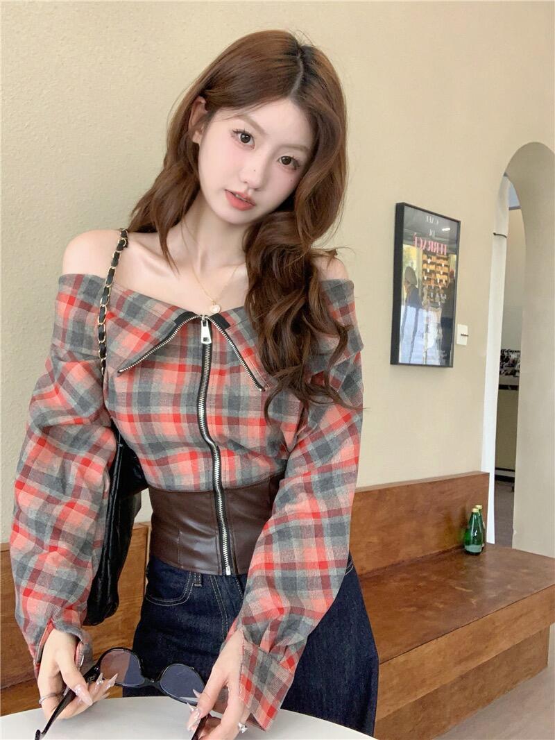 - Top: Slim-fit long-sleeve tee with plaid patchwork and off-shoulder design, soft early autumn fabric.