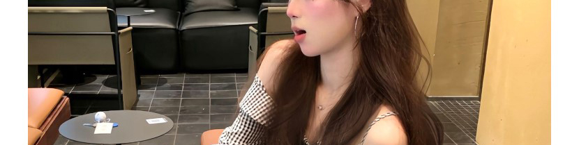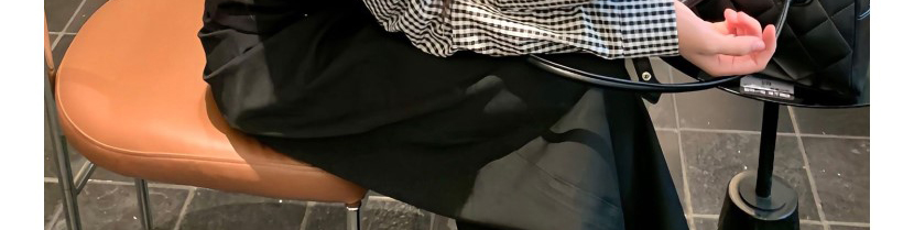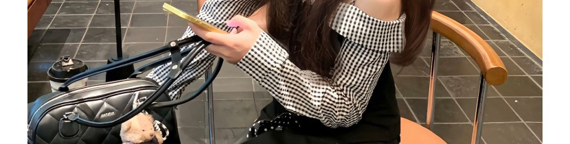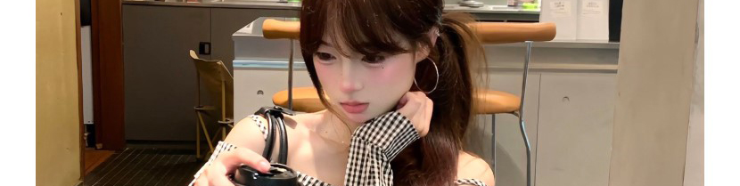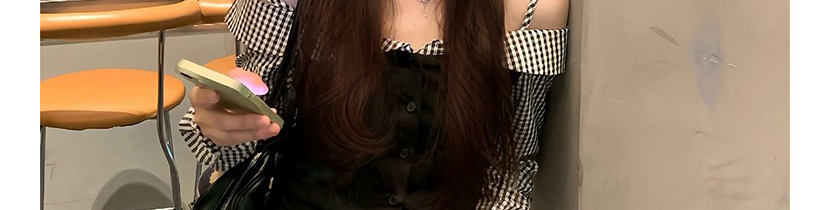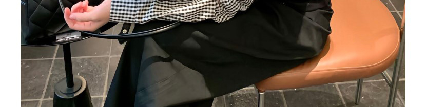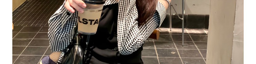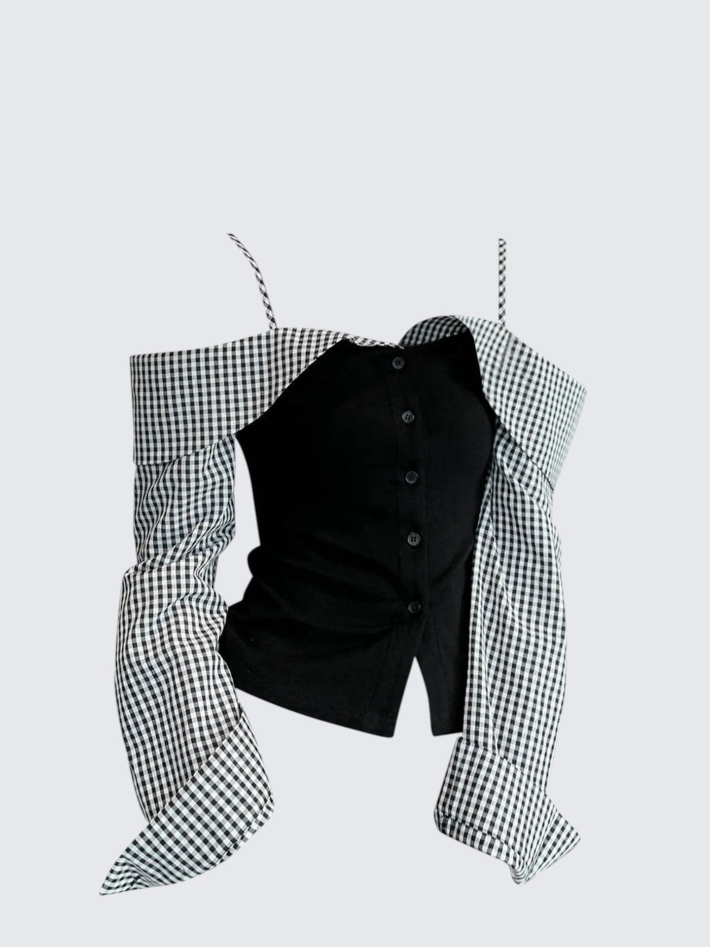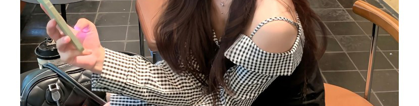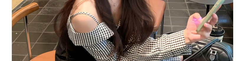 - Top: Slim-fit long sleeve tee with off-shoulder design and plaid layered detail, soft early autumn fabric.