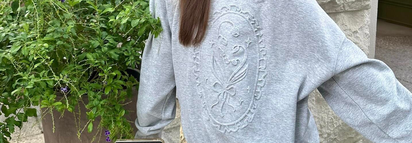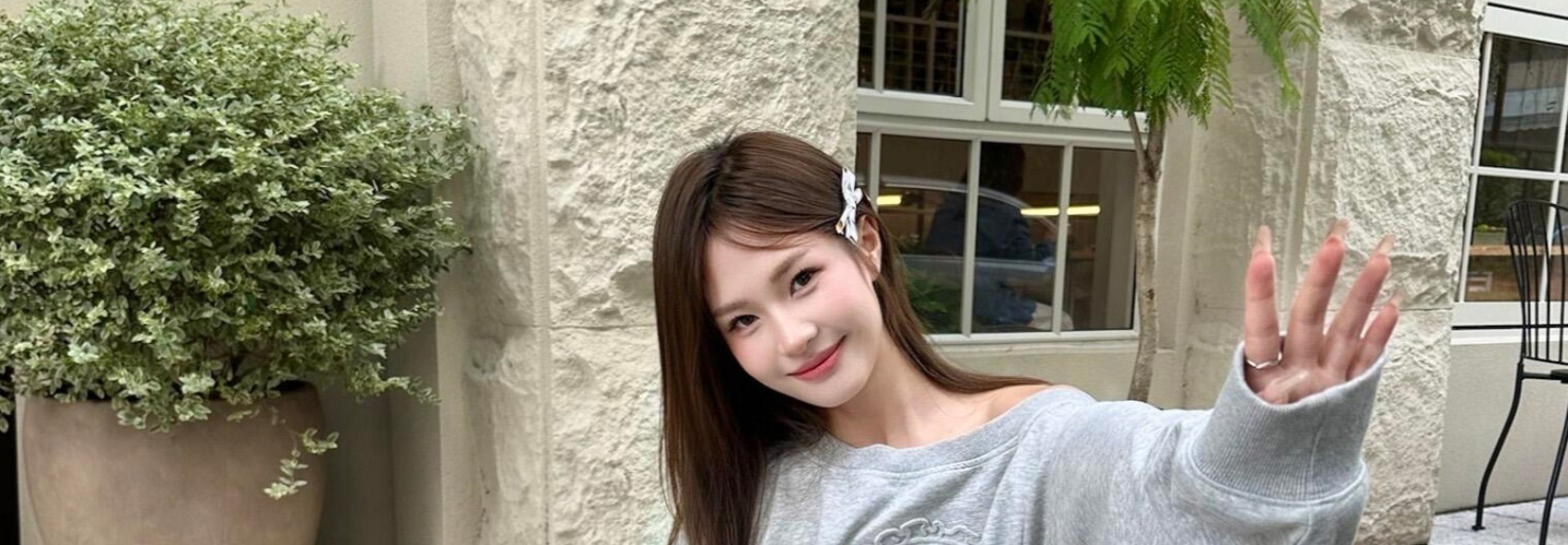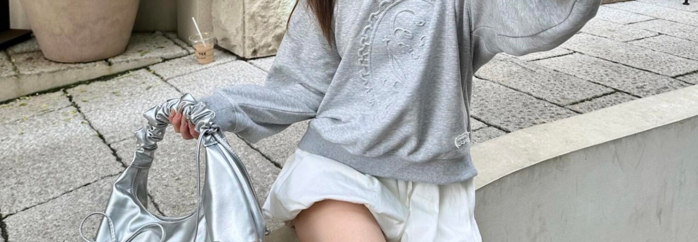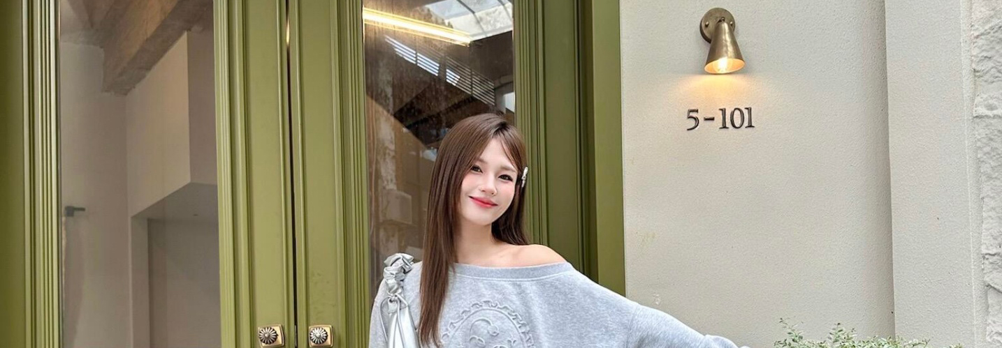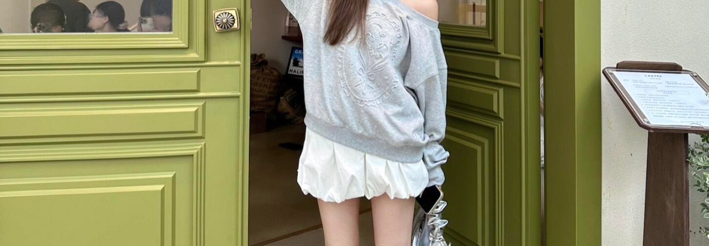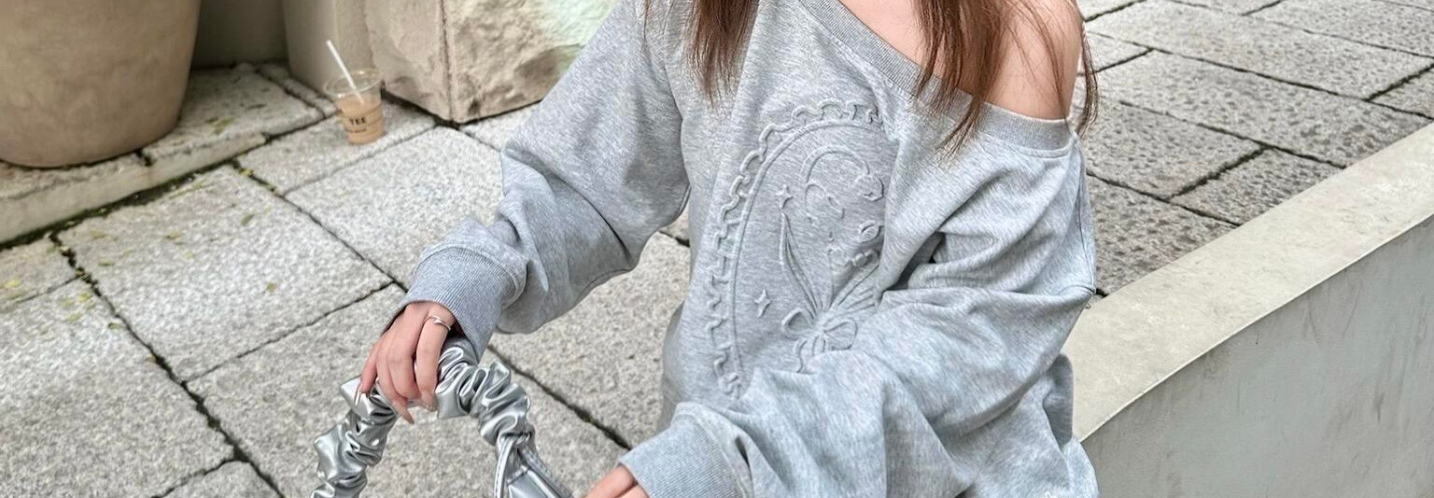 - Top: Off-shoulder sweatshirt with asymmetrical neckline and oversized fit.