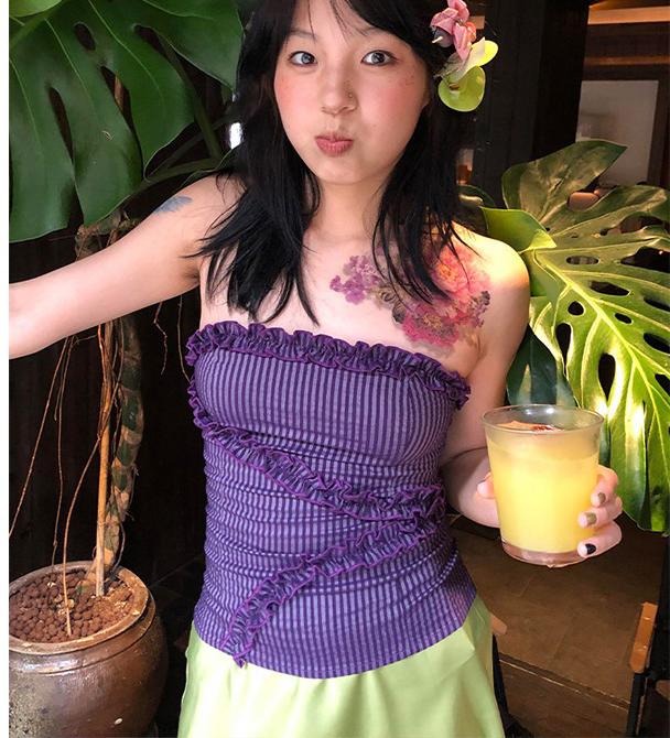 - Top: Purple lace cami with cross-back design, slim fit, perfect for edgy summer looks.