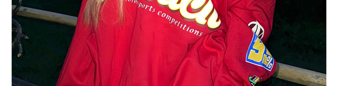 - Top: Oversized long-sleeve hoodie with asymmetrical shoulder and letter print, soft early autumn fabric.