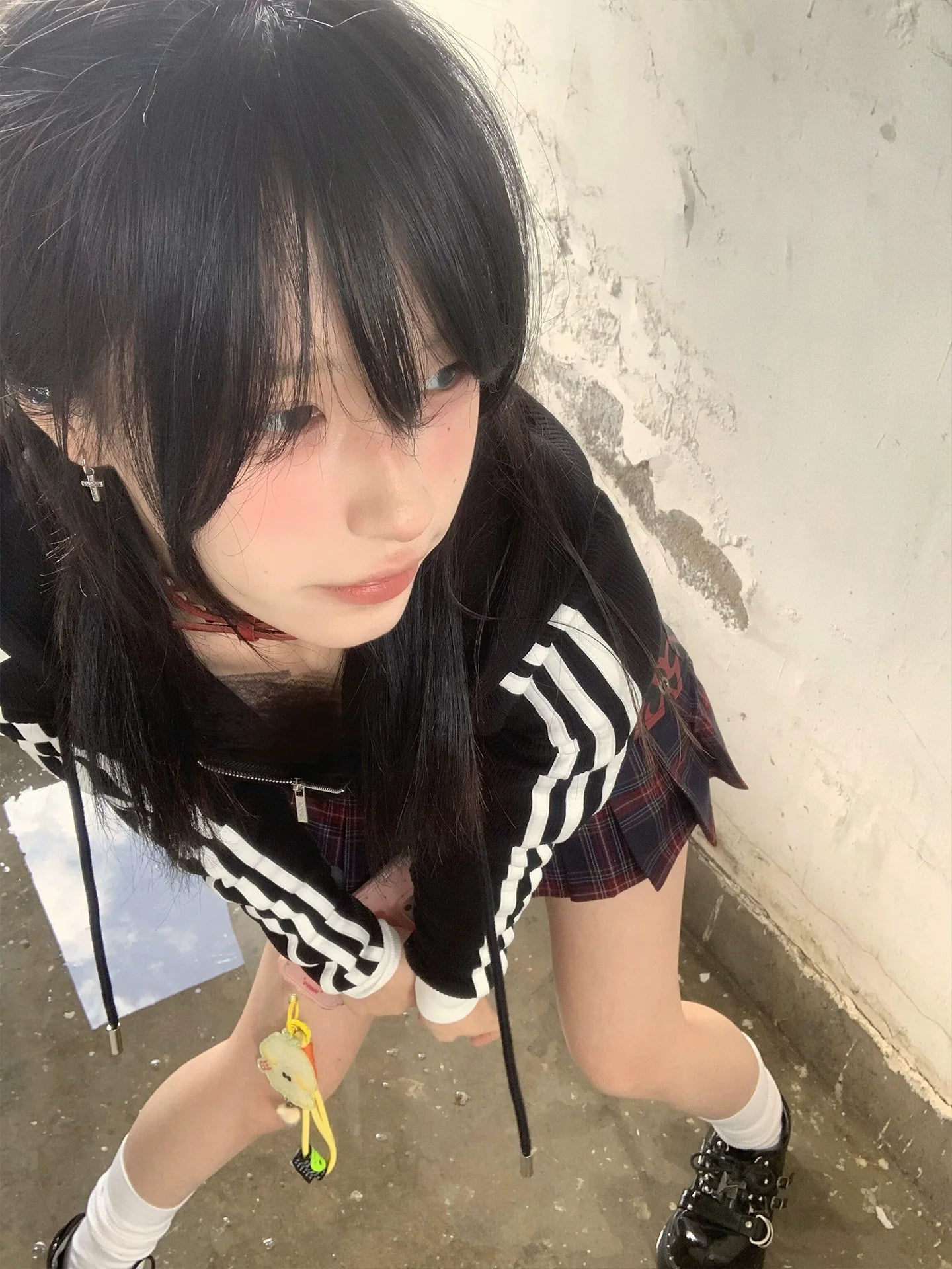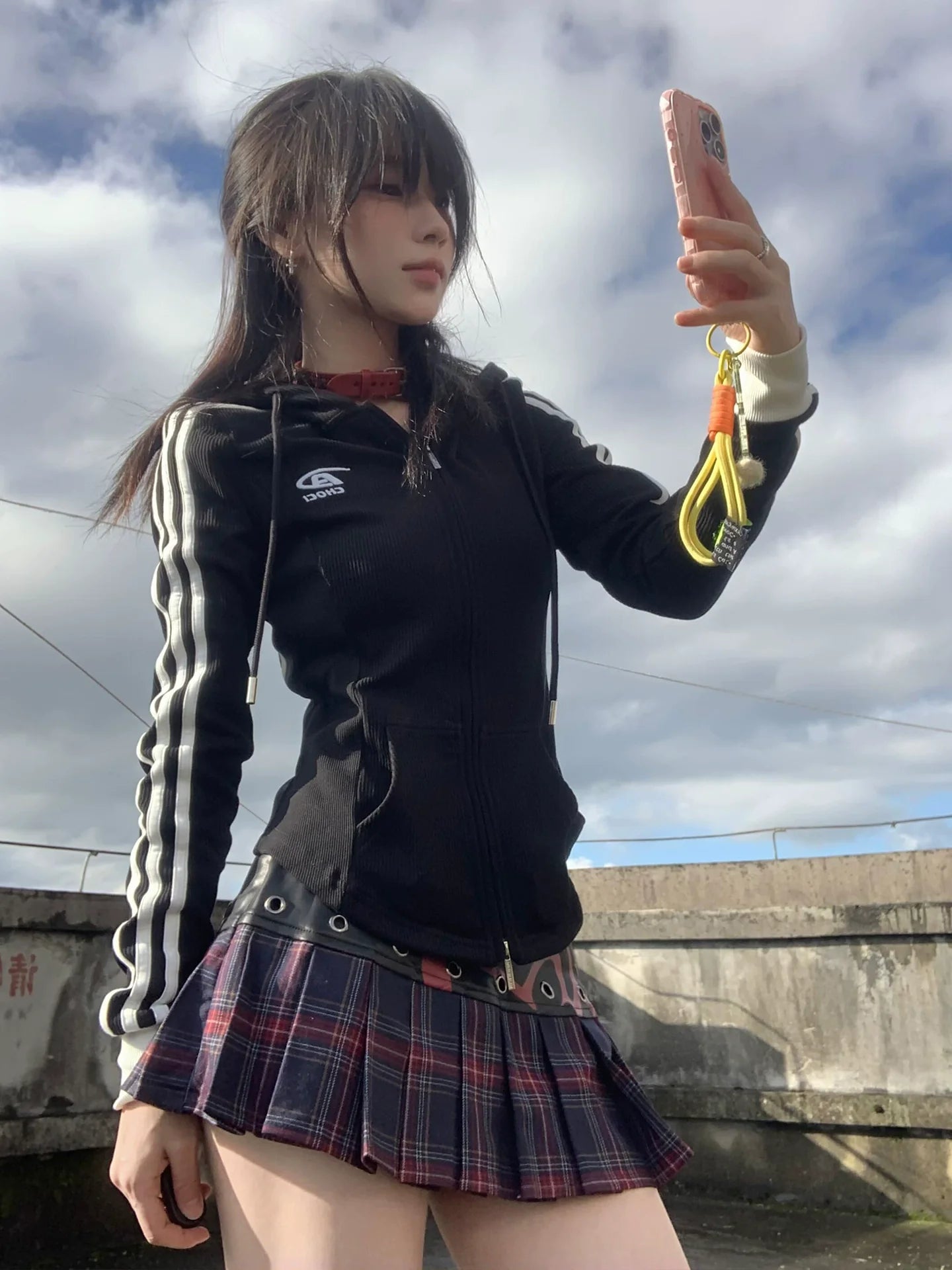 - Top: Black zip-up hoodie with vintage-inspired cut, letter embroidery, and flattering slim fit silhouette.