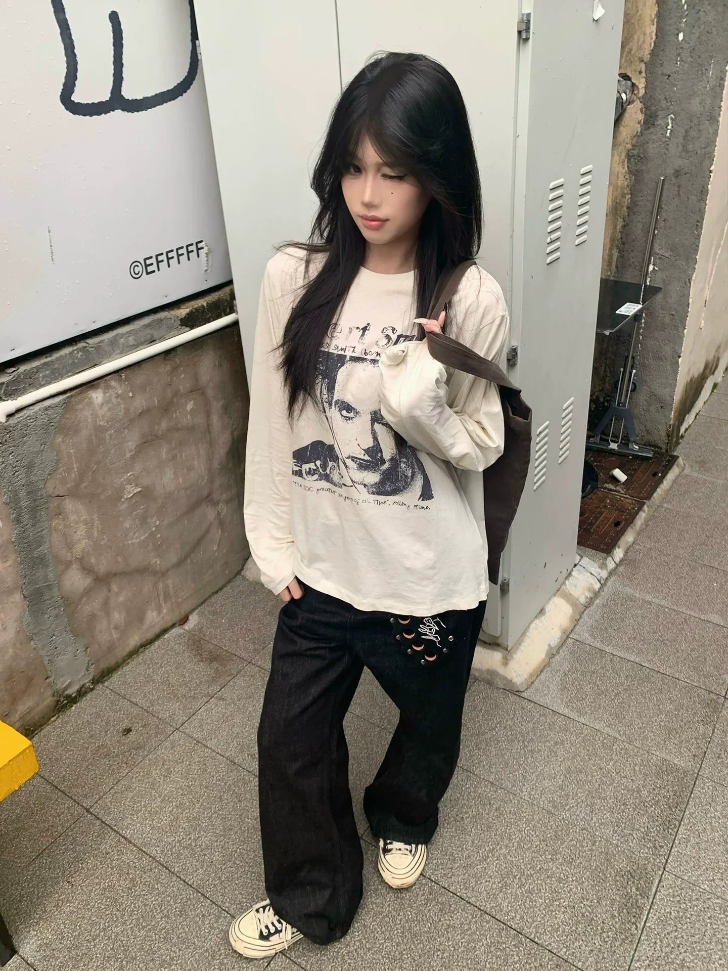 - Top: Loose-fit long sleeve tee featuring vintage portrait print and distressed washed effect for retro charm.