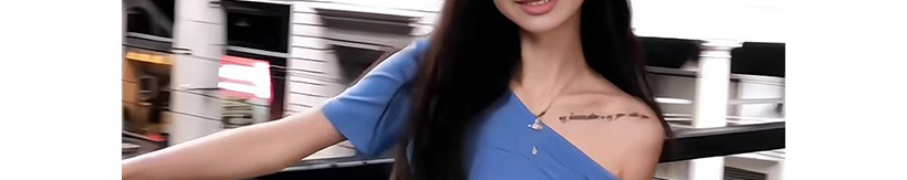 - Top: Slim-fit short sleeve cotton tee with asymmetric off-shoulder cut and tie detail, soft summer fabric.