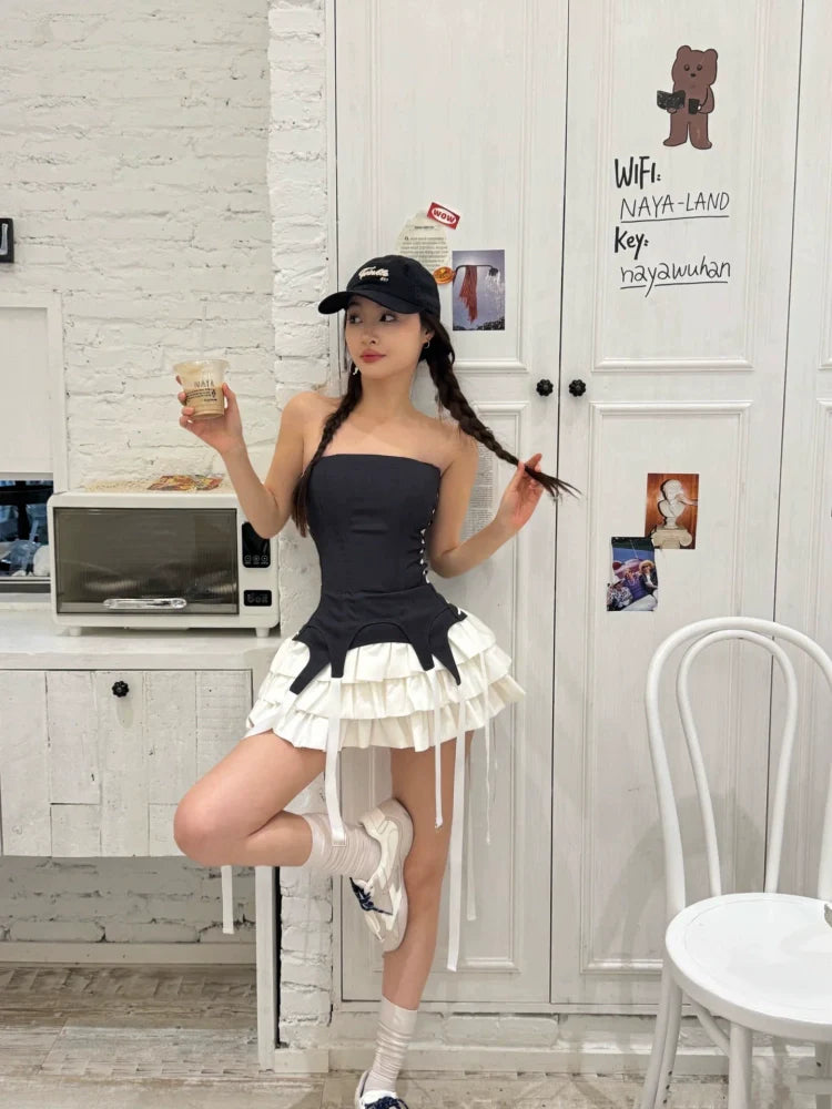 American-Style Tube-Top Sexy Tiered Fake Two-Piece Petite-Friendly Summer Mini Dress