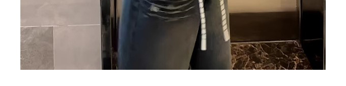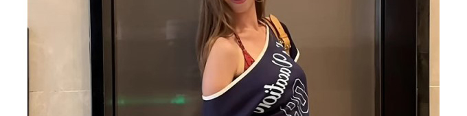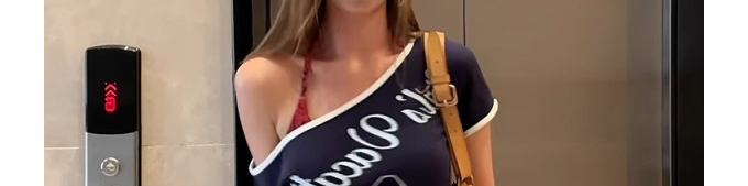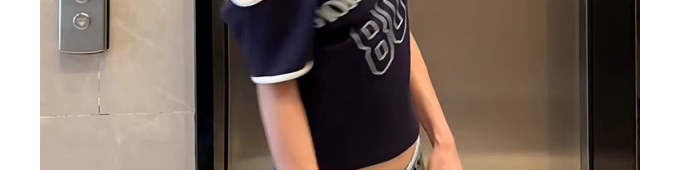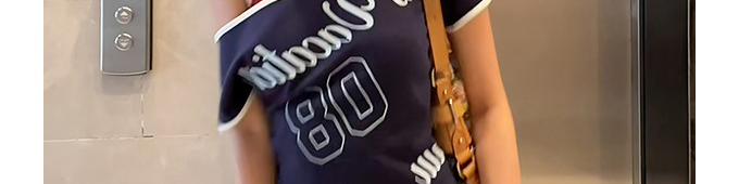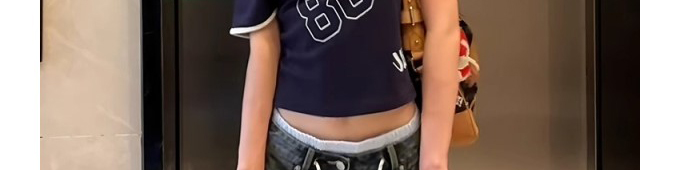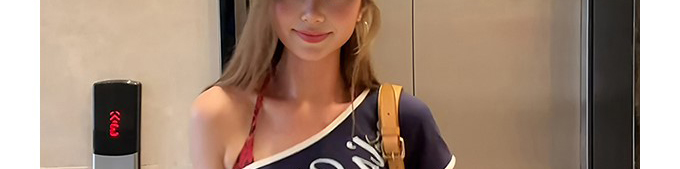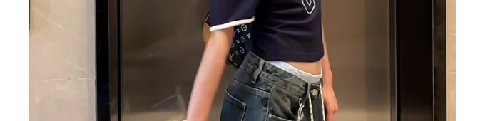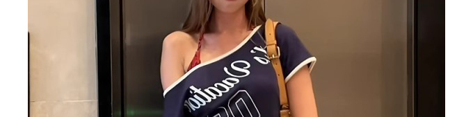 - Top: Navy one-shoulder short sleeve T-shirt with print and color-block details, slim fit, retro American style.