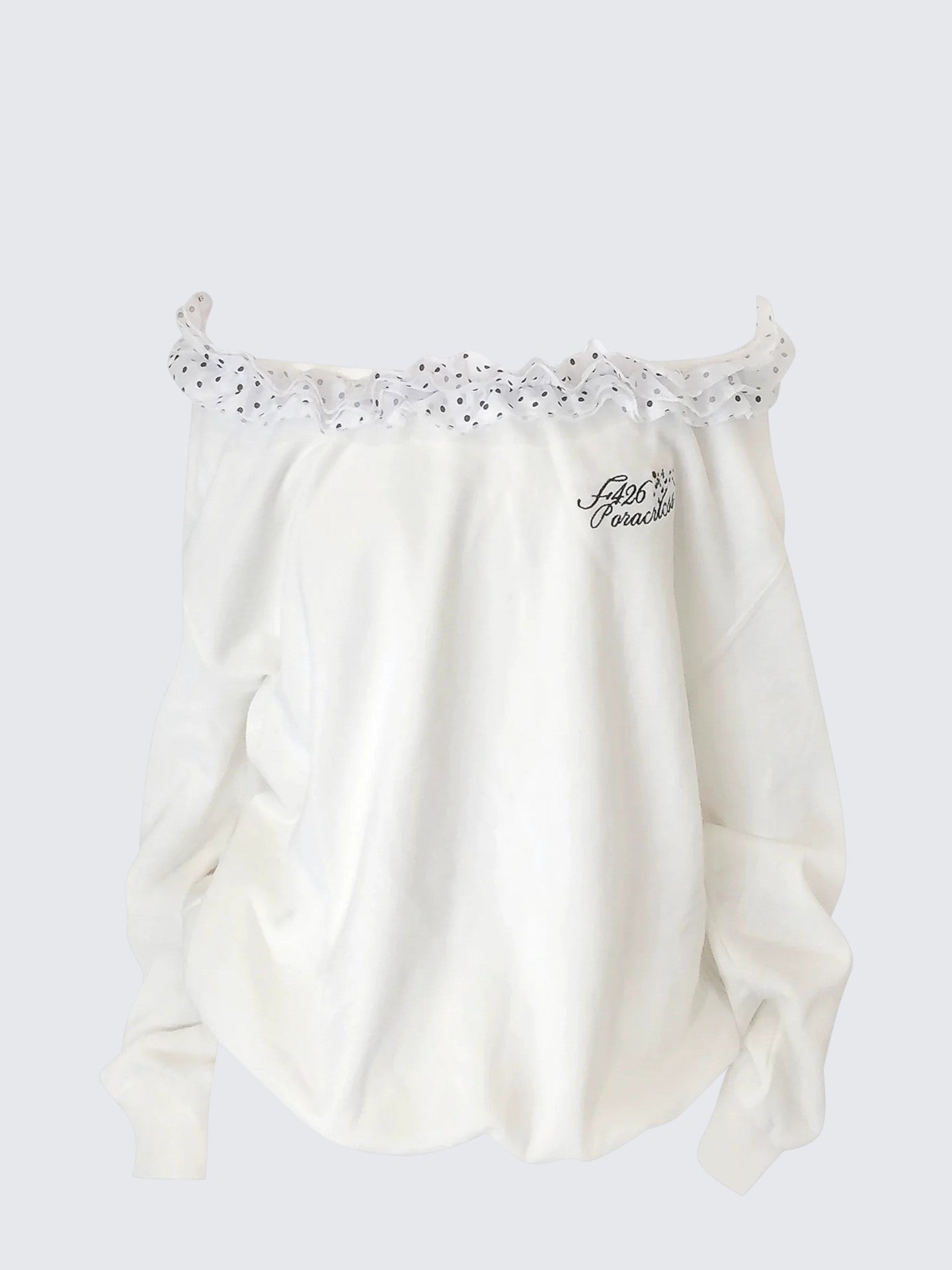 - Top: Loose-fit long sleeve sweatshirt with polka dot print and lace trim, off-shoulder design, soft autumn fabric.