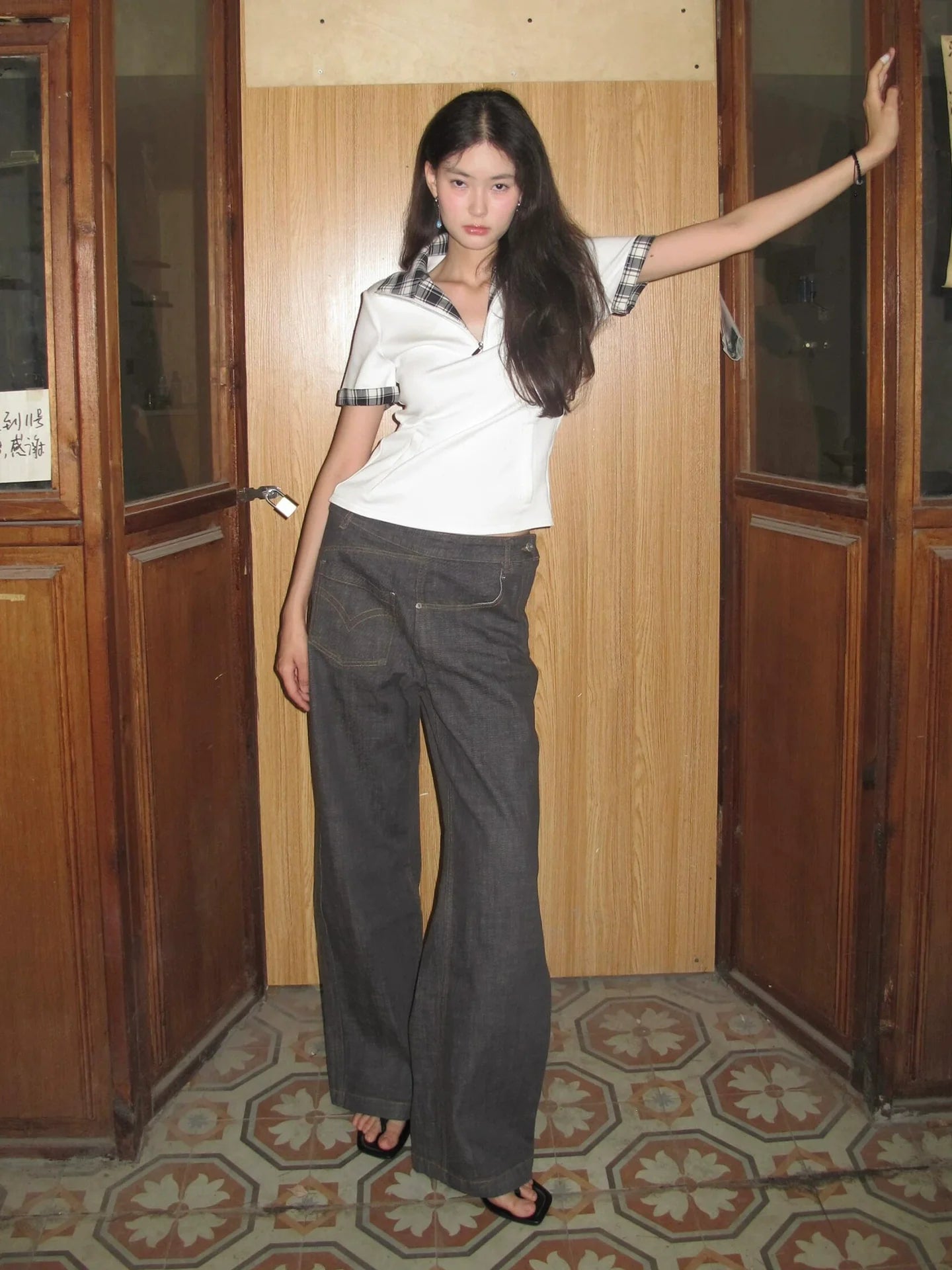 - Top: Summer polo tee with stand collar, checkered patchwork design, slim fit, soft cotton, structured shoulder, American retro Y2K style.