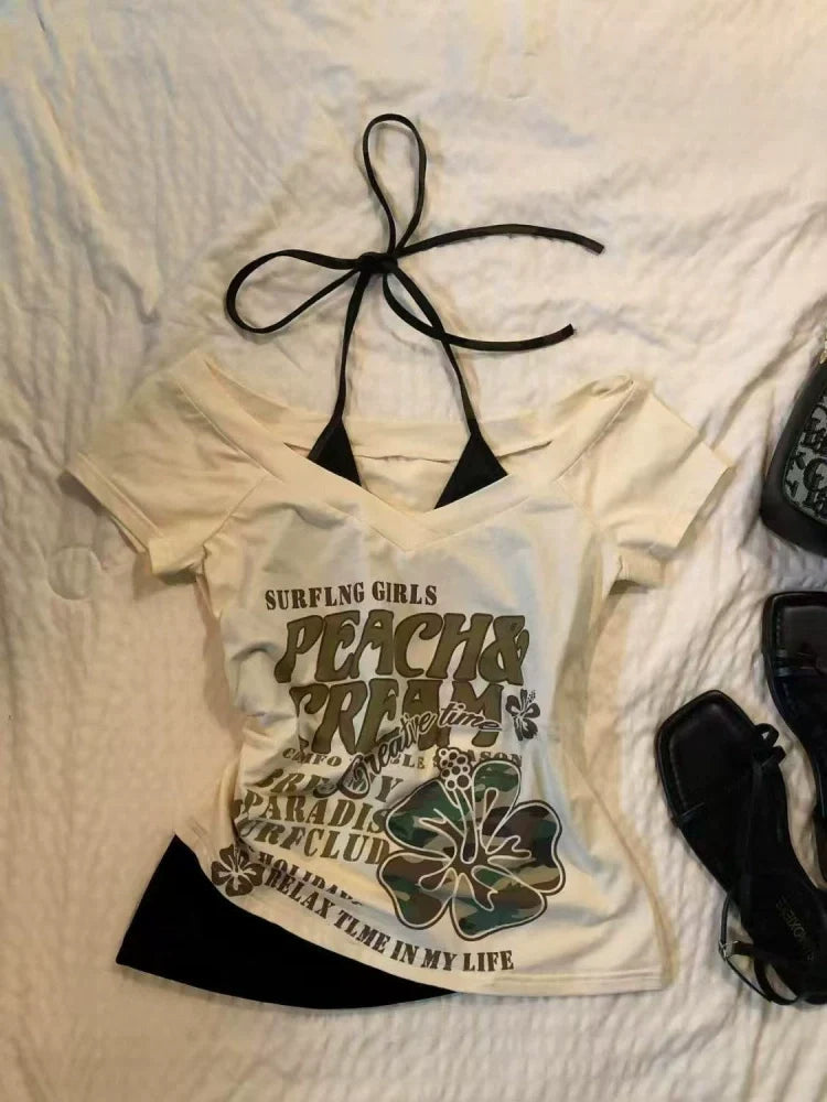 - Top: Apricot fake two-piece short sleeve top with V-neck and American retro prints, blending Y2K "Abi" () subculture and e-girl style. Lightweight for summer.