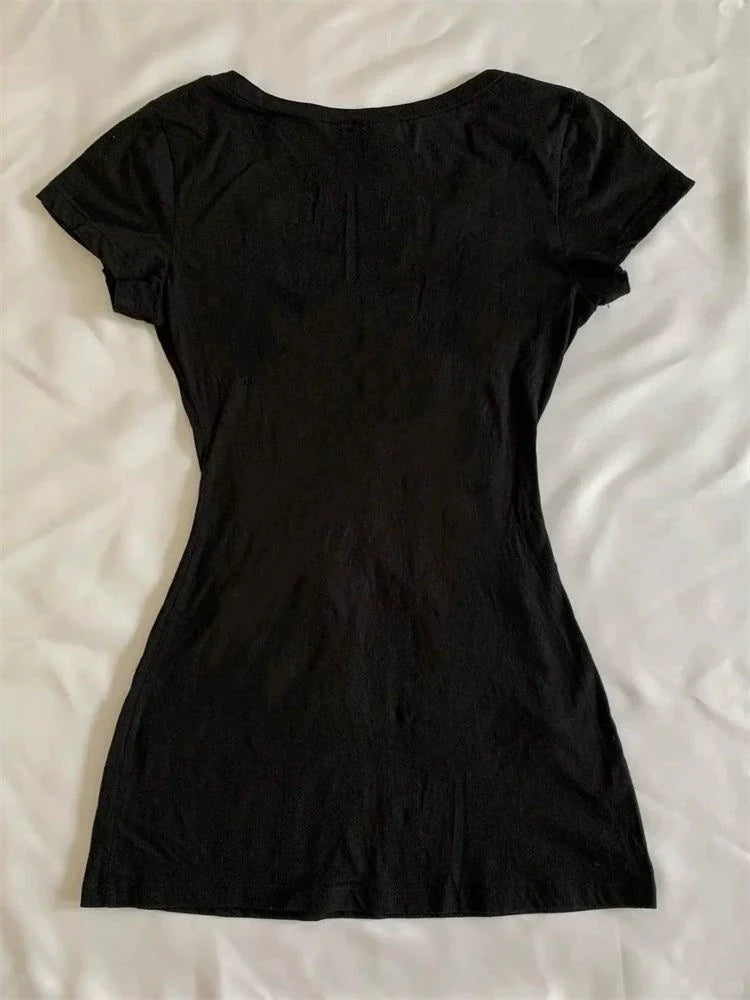 - Top: Black short sleeve top with retro prints, balancing gothic rock punk edge and Y2K "Abi" light subculture vibes. Slim fit for subtle edginess.