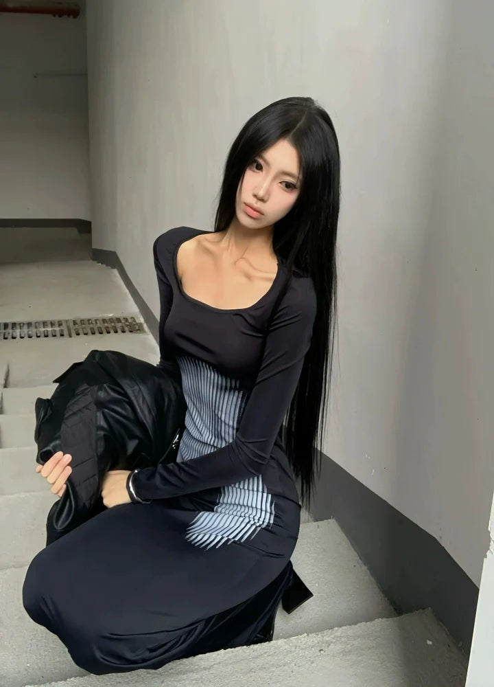 - Dress: Black bodycon maxi dress with printed pattern and high-stretch fabric. Slim-fit silhouette hugs curves comfortably while allowing mobility.
