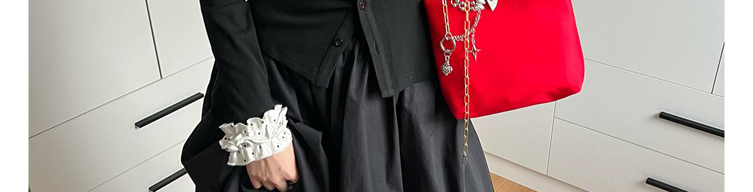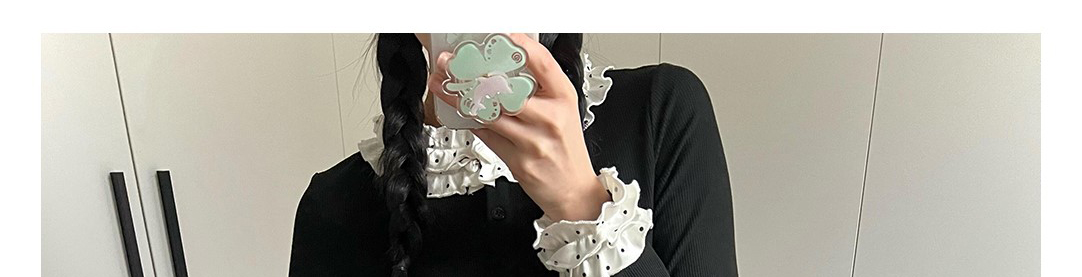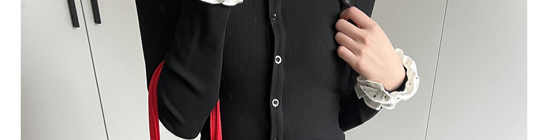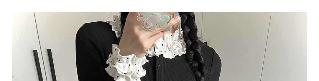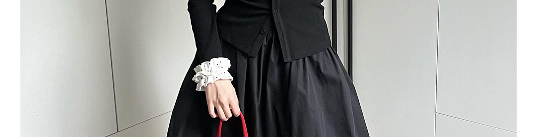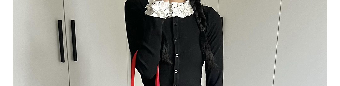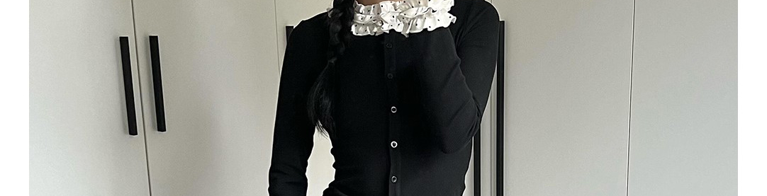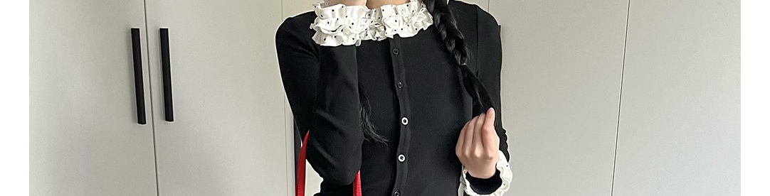 Black long sleeve knit cardigan with polka dot and lace details. Slim fit and versatile for autumn layering.