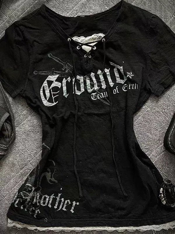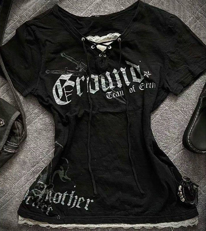 Black Punk Y2K E-girl Shibuya Girl Fake Two-Piece Lace Print Slim-Fit Short Sleeve Top