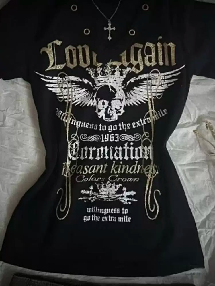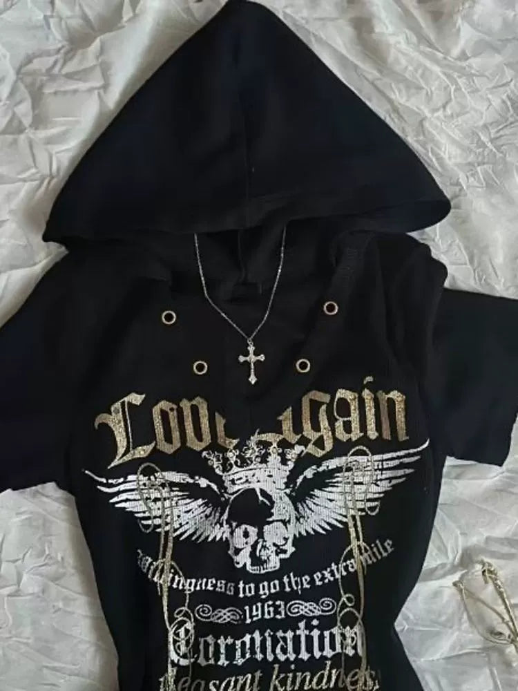 Black Subculture Rock Punk Y2K Abi E-girl American Retro Print Hooded Short Sleeve Top