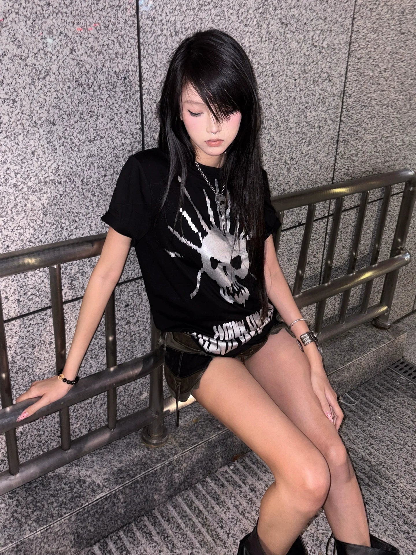 - Top: Summer short sleeve tee with silver skull print, fitted cut, black fabric, Y2K punk aesthetic, slim visual kei style.