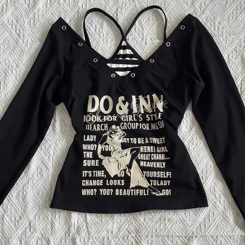 - Top: Black V-neck tee with retro letter print, paired with striped cami layer.