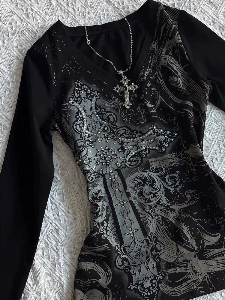 Black Tie-Dye V-Neck Long Sleeve Tee Y2K Top