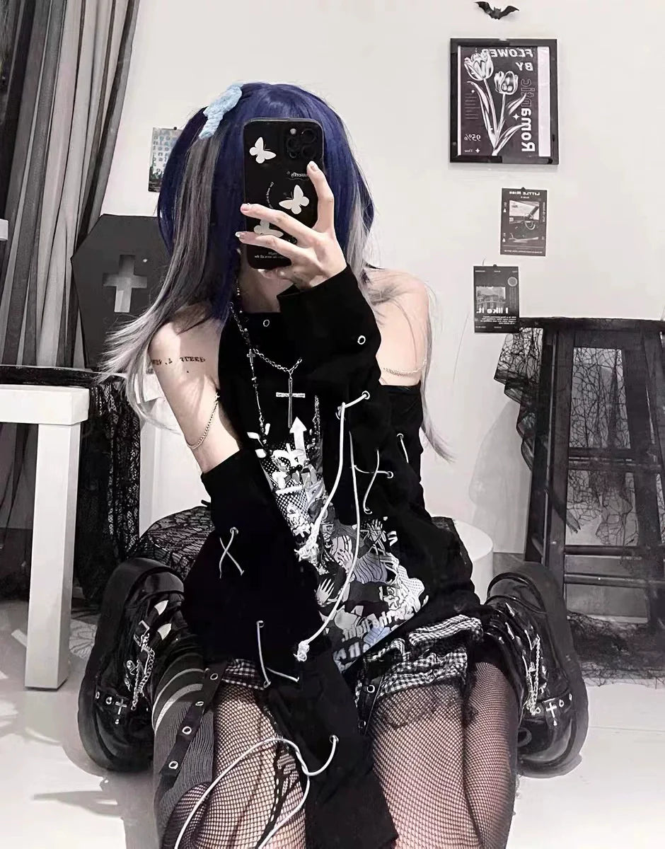 - Top: Black off-the-shoulder short-sleeve T-shirt with bondage-style tie details, paired with a free cross necklace (), blending punk energy and Y2K subculture style for summer.