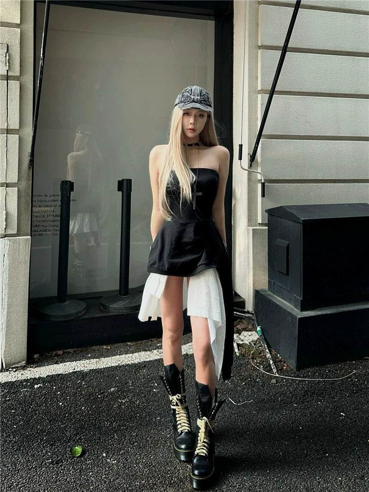 - Dress: Black midi dress with tube top design, open-back detail, and asymmetrical hemline. Stretchy fabric provides a comfortable, figure-hugging fit.