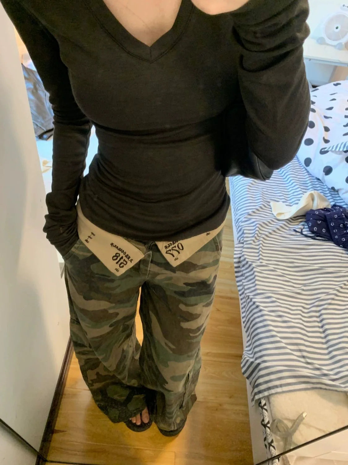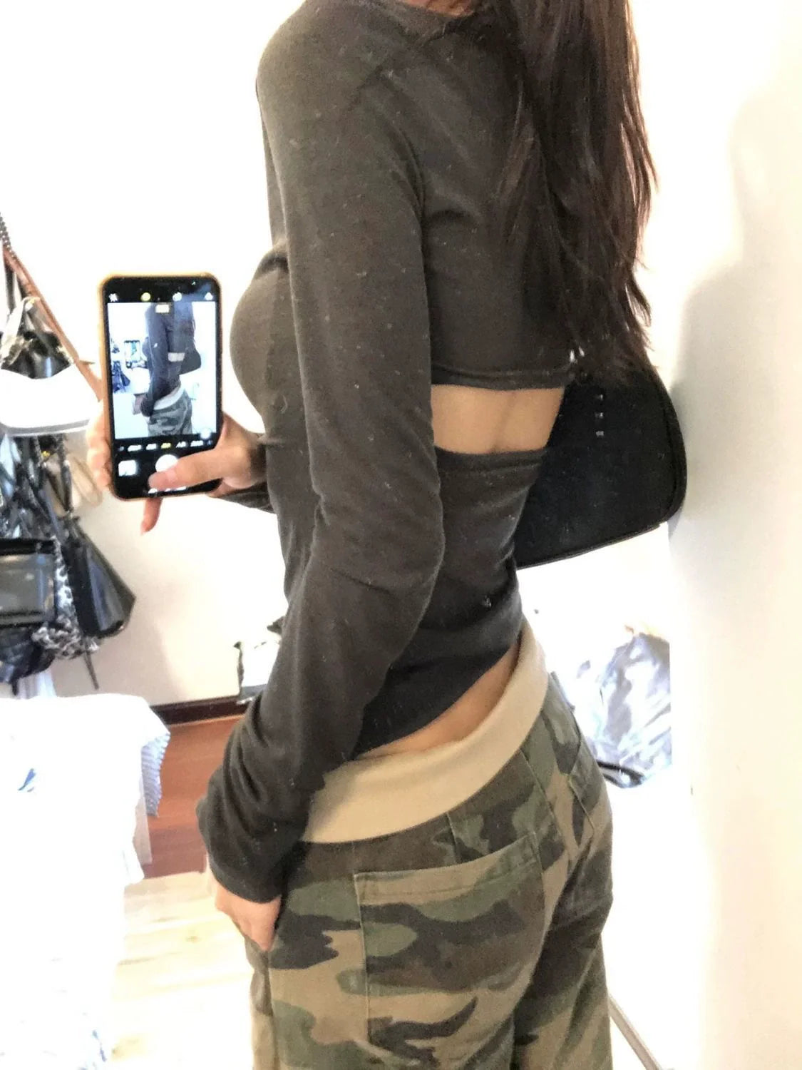 - Top: Black thin long-sleeve T-shirt with vintage open-back design and V-neck, featuring a slim fit that flatters the figure, ideal for Y2K subculture summer-to-fall styling.
