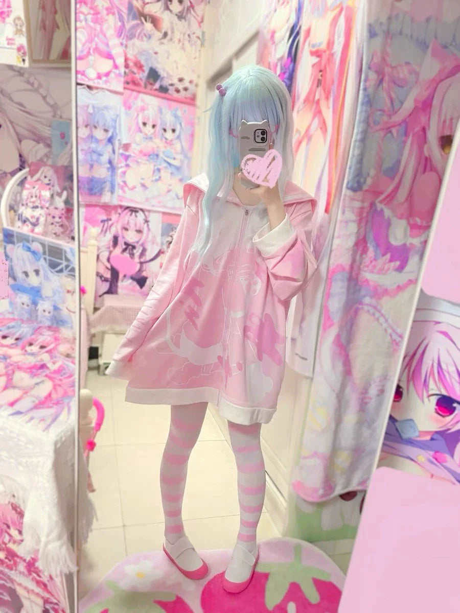 - Hoodie/Jacket: Black and white fleece-lined hoodie (spring-autumn style) with Y2K subculture vibe, featuring anime "injured cat" print, cute cat ears, and a naval collar—ideal for transitional weather.