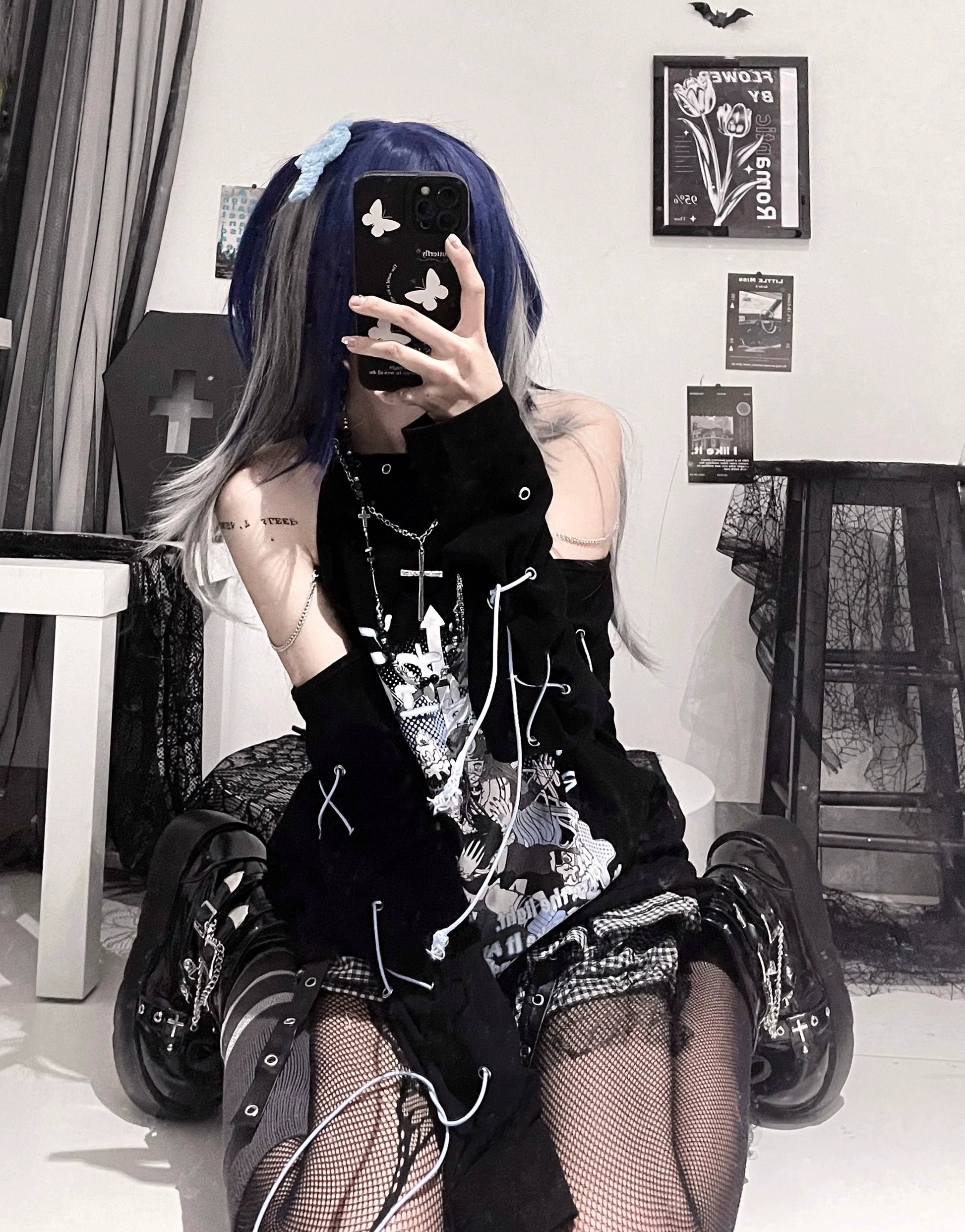 - Look: An edgy, glamorous piece perfect for punk parties, subculture outings, or winter dates, blending off-shoulder femininity with bondage ties and a complementary cross necklace.