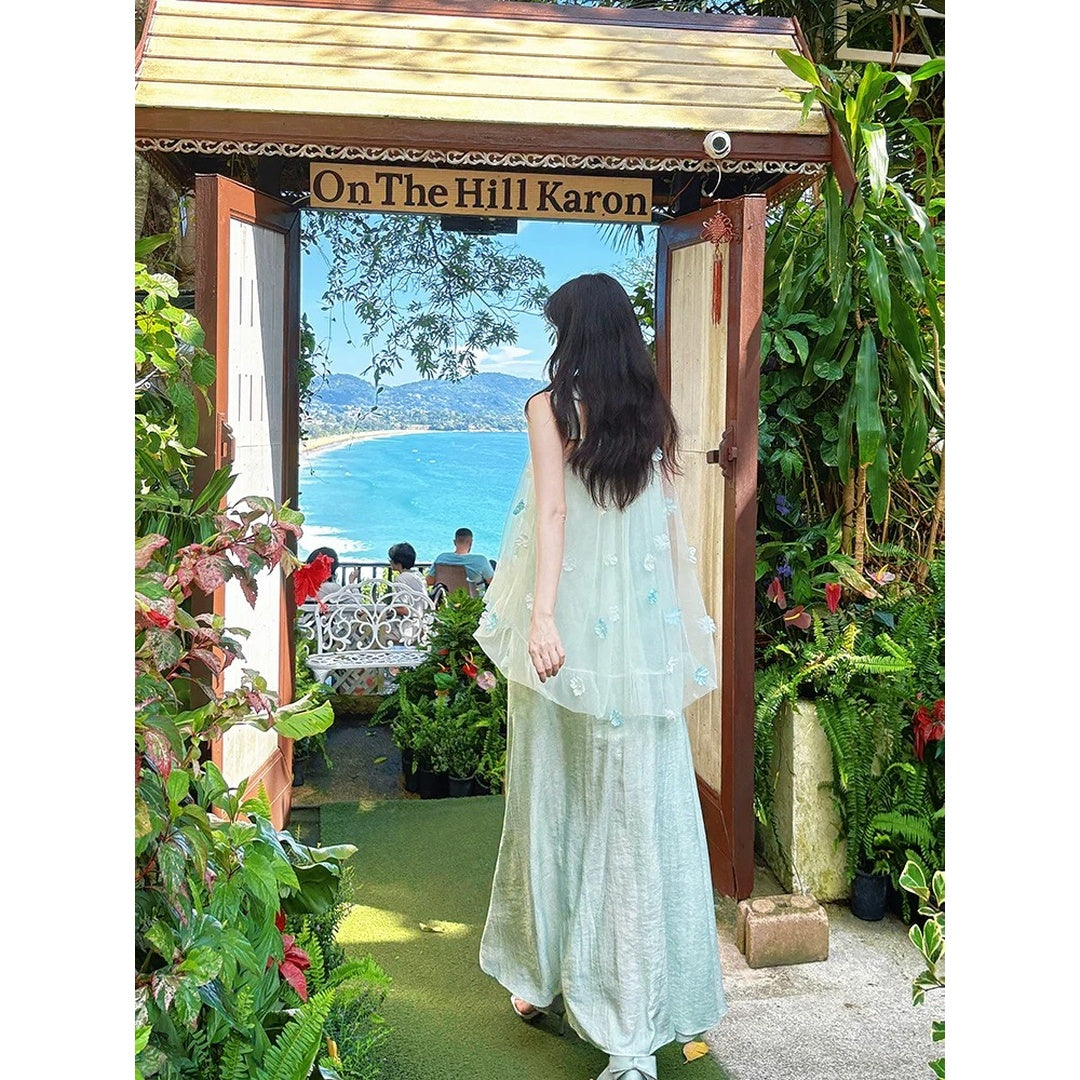 - French halter gown dress with 3D flower detailing and tulle overlay. Luxurious and high-end, perfect for resort vacations or formal events.