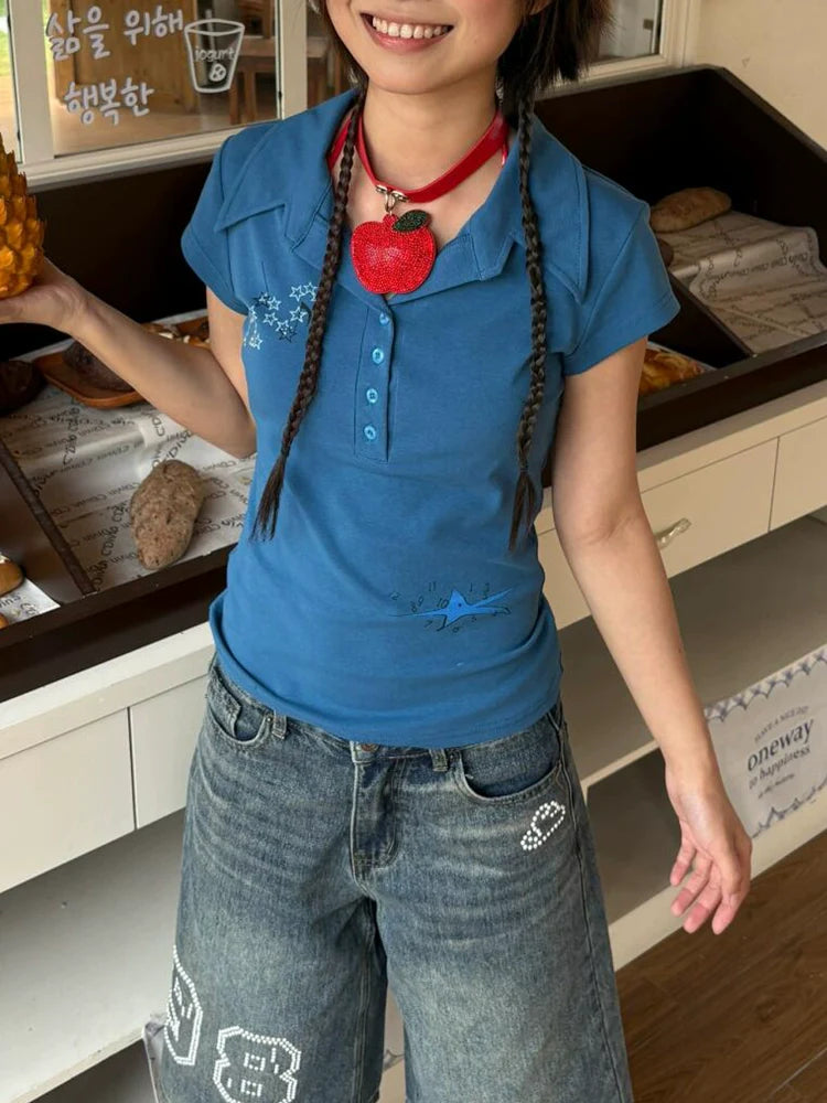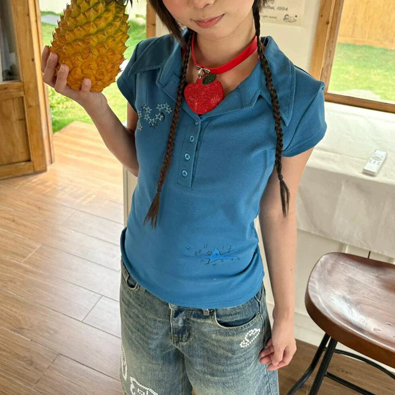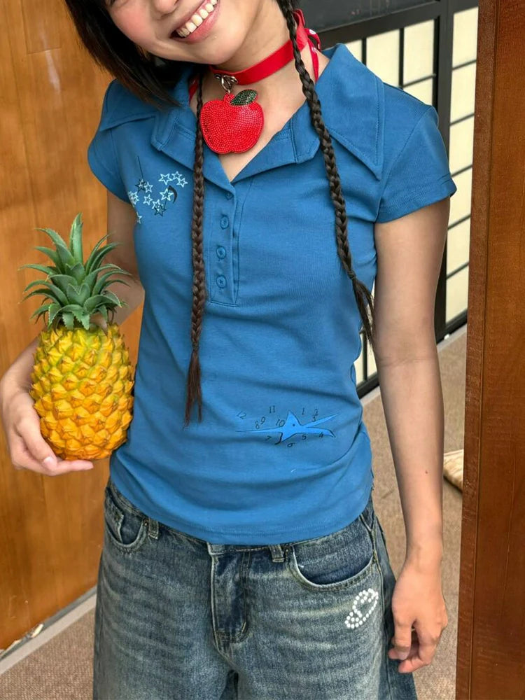 Blue Cropped Polo Shirt Y2K Retro Fitted Short Sleeve Top
