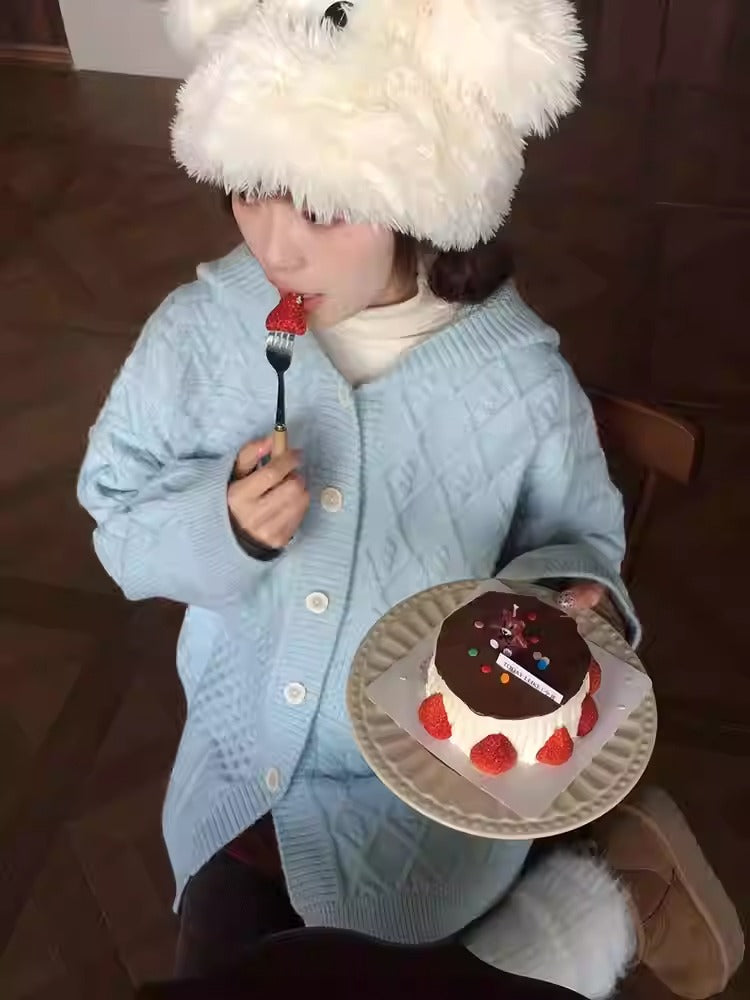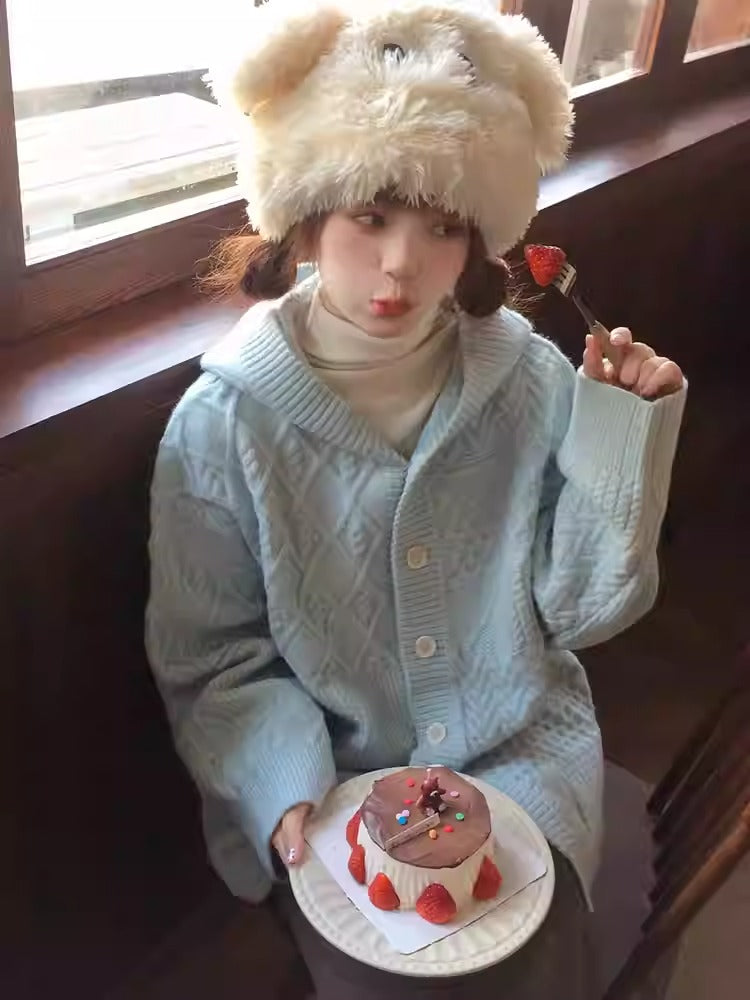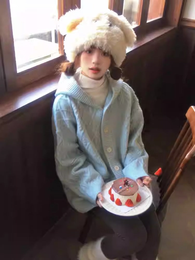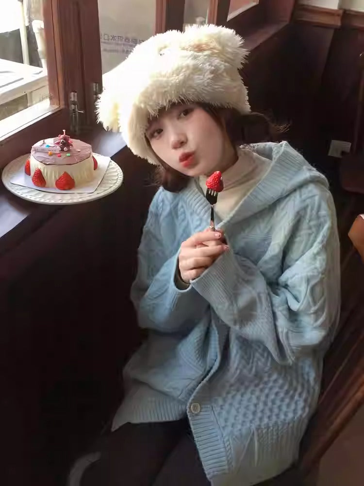Blue knit cardigan with hood. Mid-length, thick and cozy for autumn and winter layering.