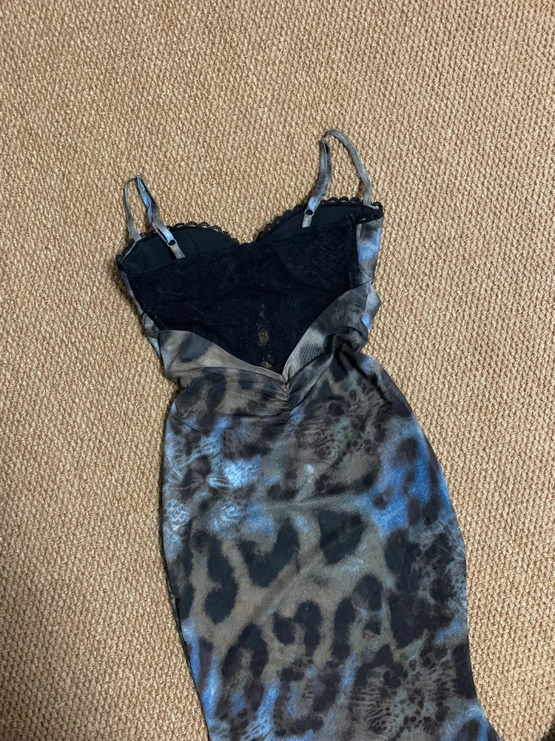 - Dress: Blue leopard print halter maxi dress with black lace upper panel and tie detail, combining elegance with edgy Y2K style.