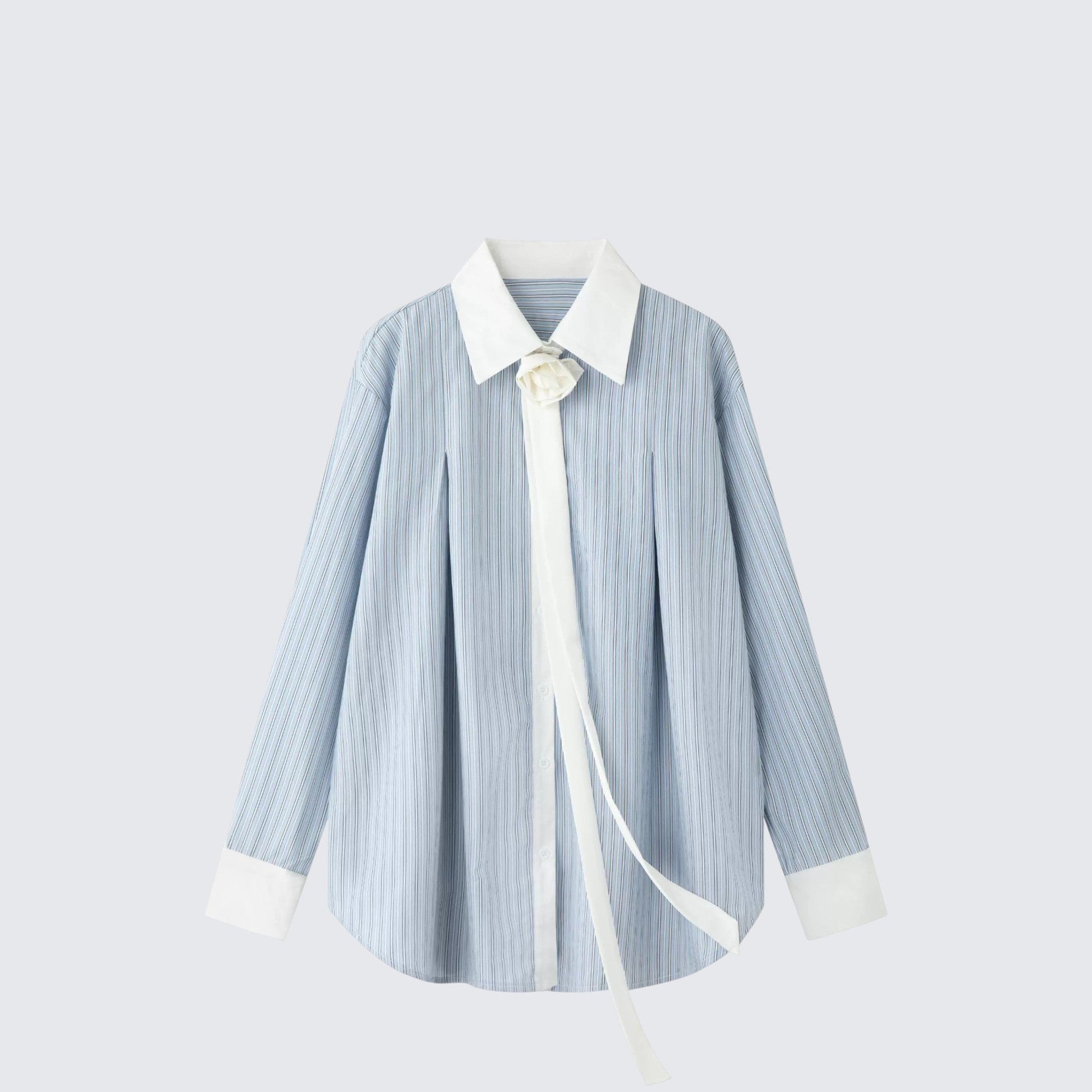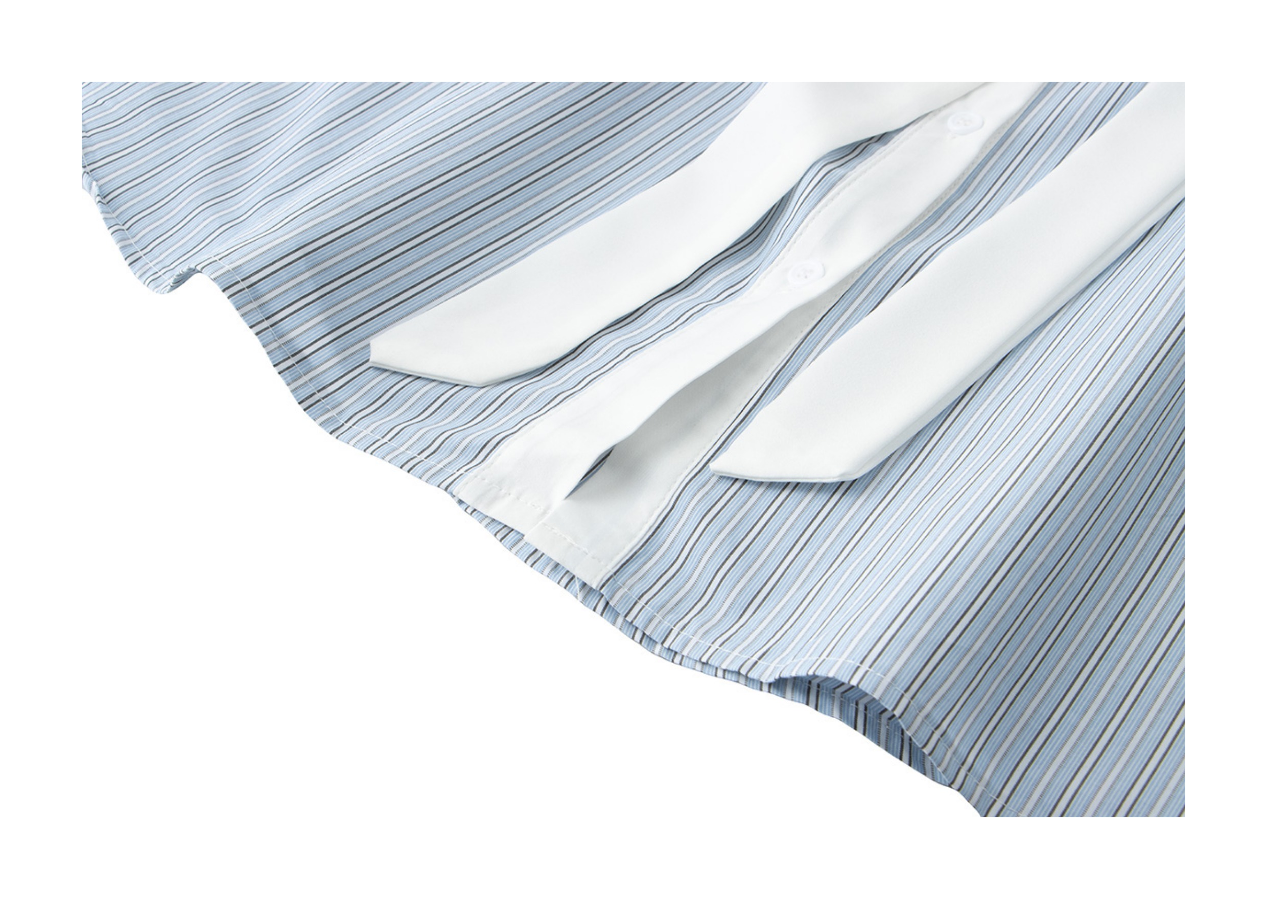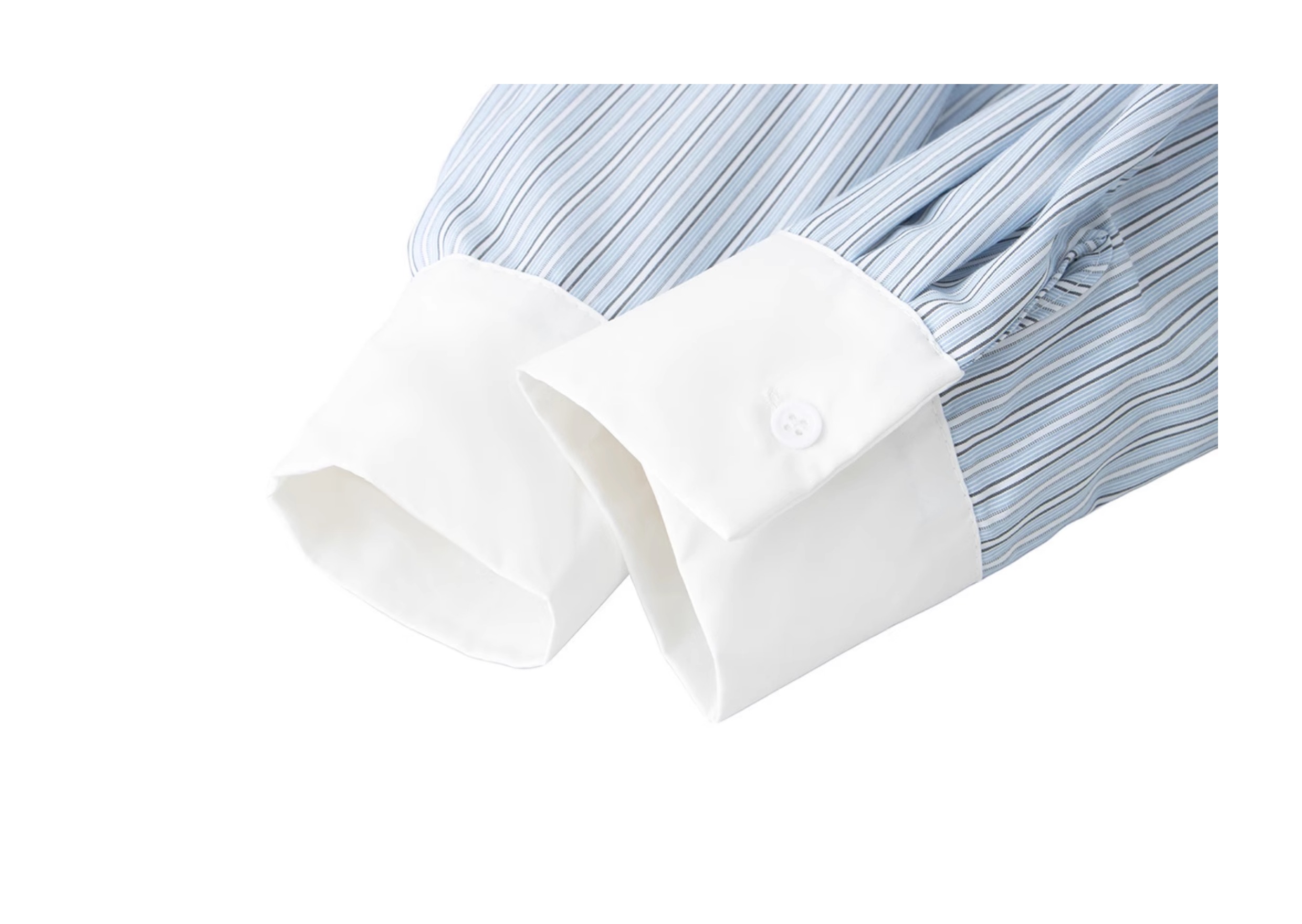 - Shirt: Blue striped loose-fit shirt with patchwork detailing and casual chic silhouette.