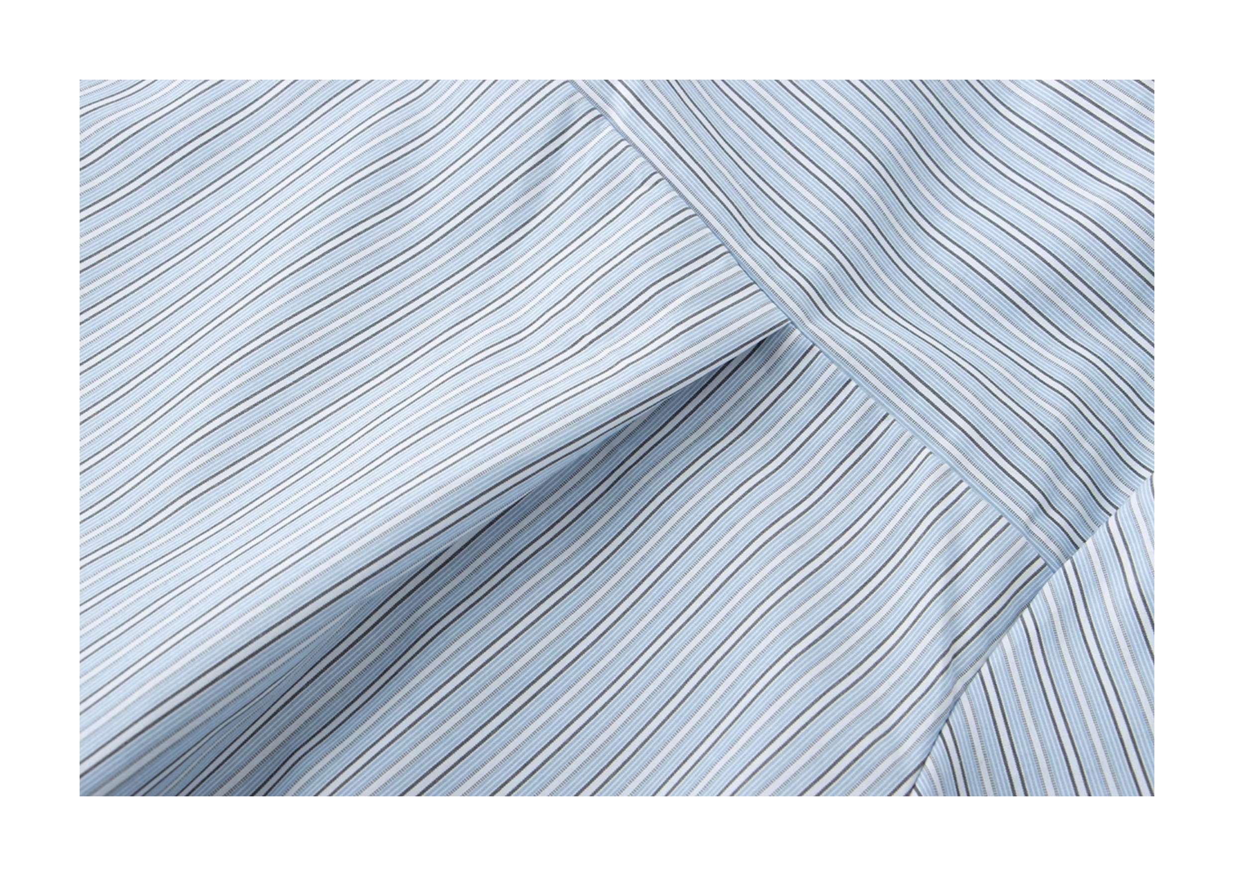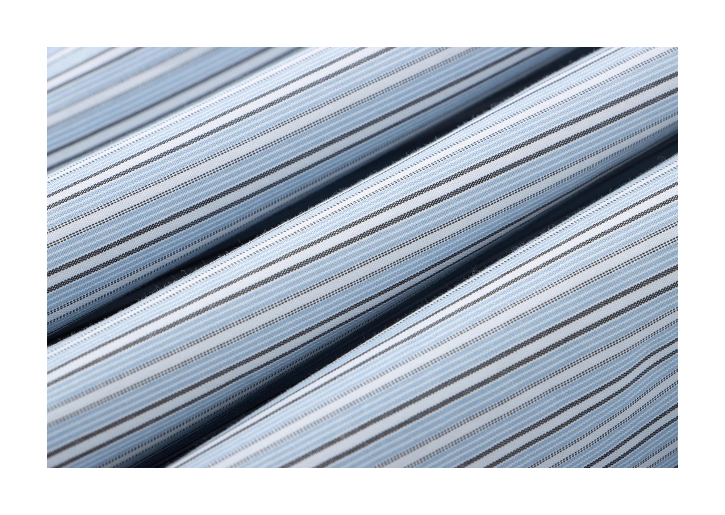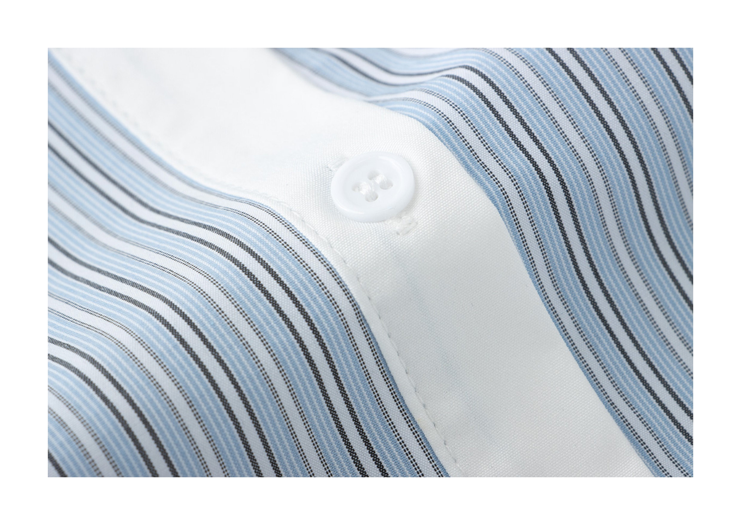 - Shirt: Blue striped loose-fit shirt with patchwork detailing and casual chic silhouette.