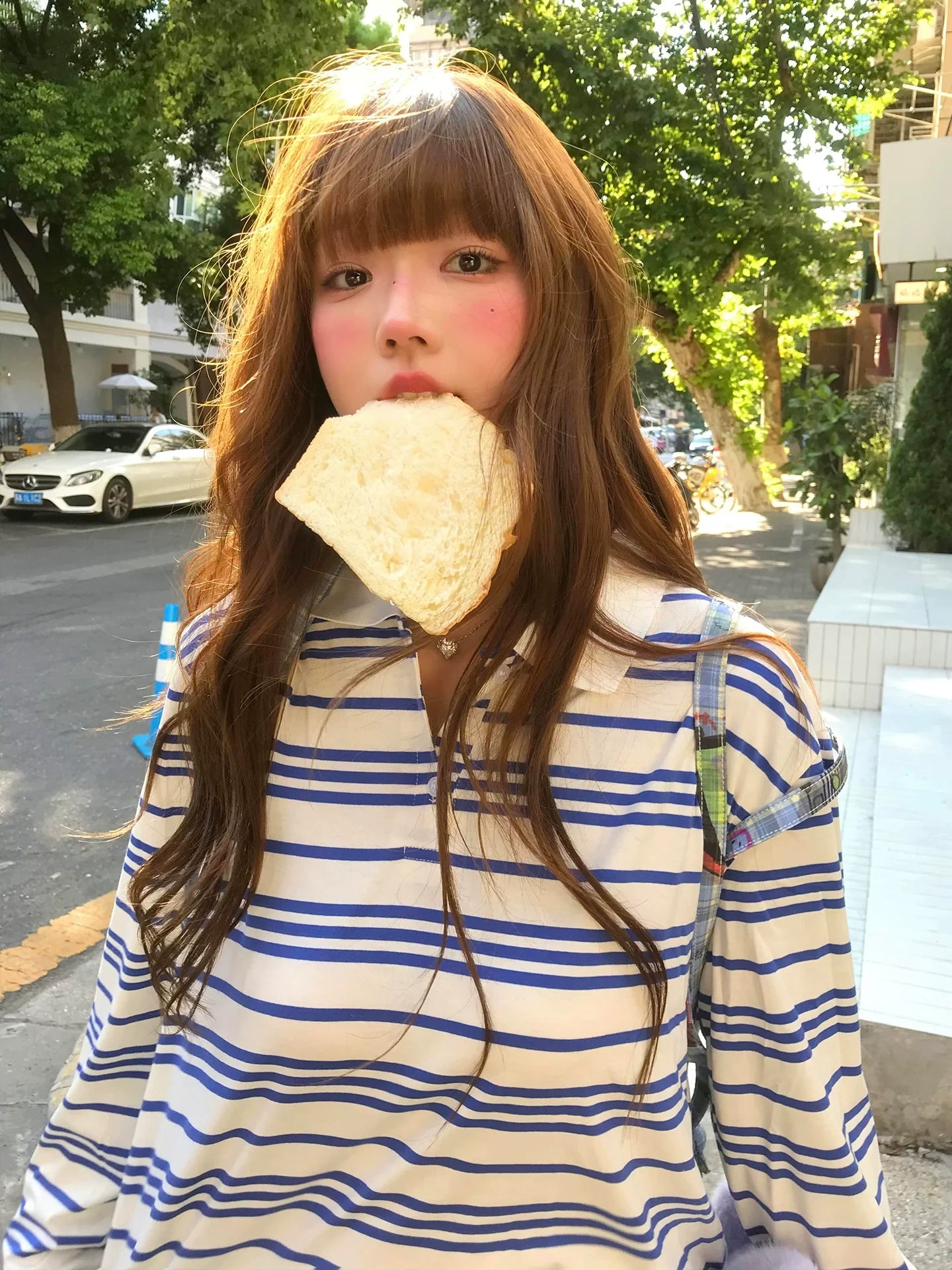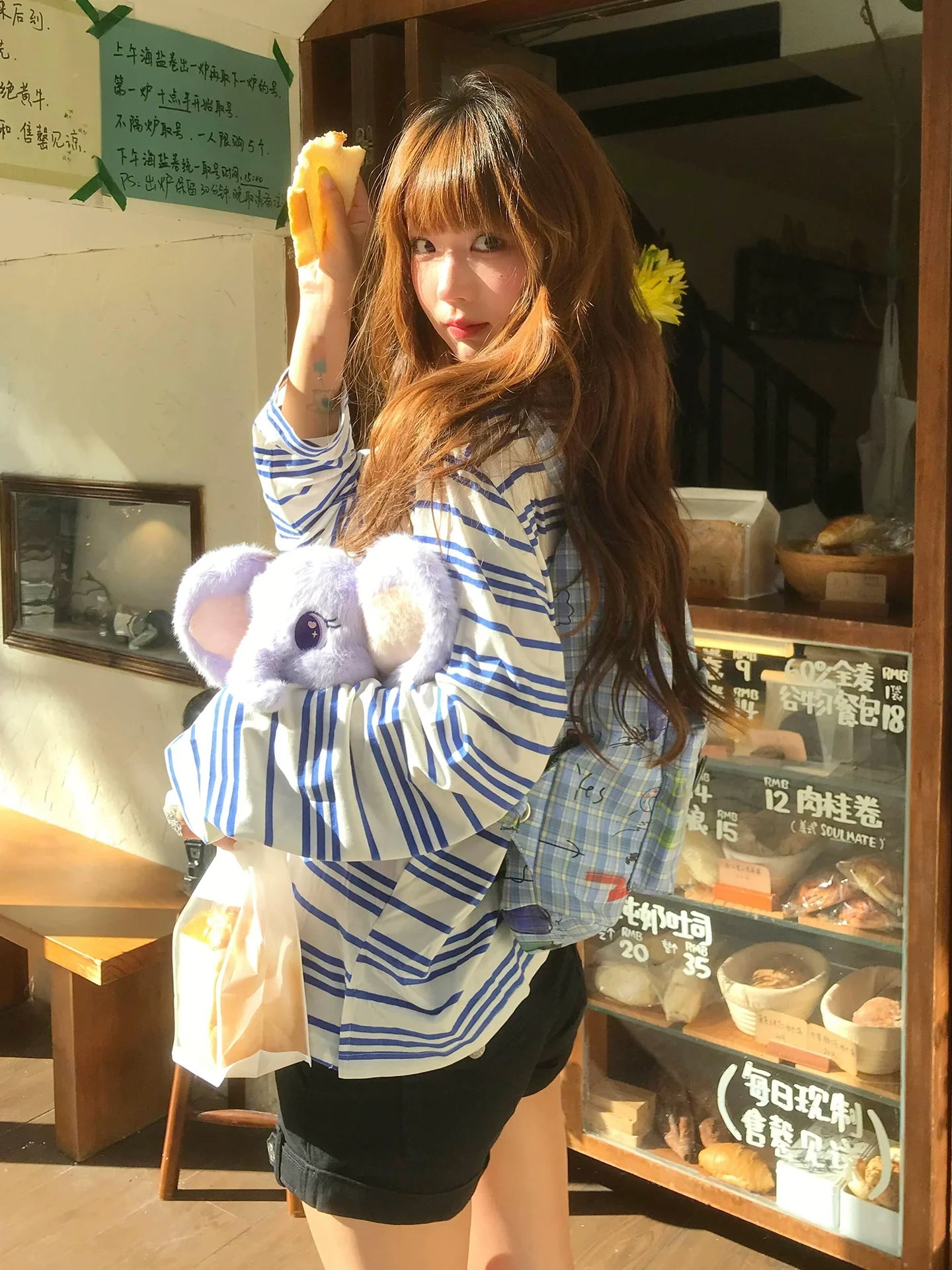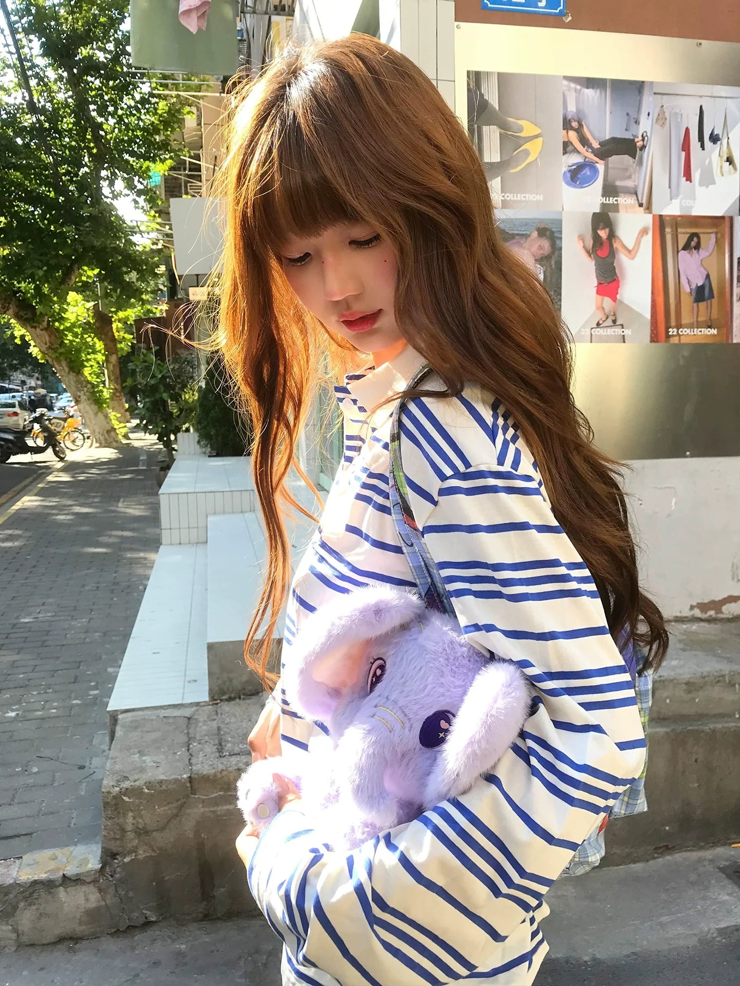 - Top: Early autumn long sleeve polo tee with blue stripes, relaxed fit, Korean style, soft cotton fabric, schoolgirl-inspired aesthetic.