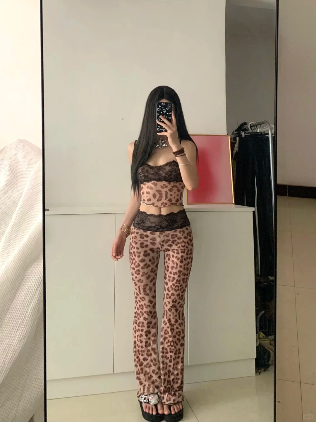 Brown Leopard Cami and Flare Pants Y2K Two Pieces Sets