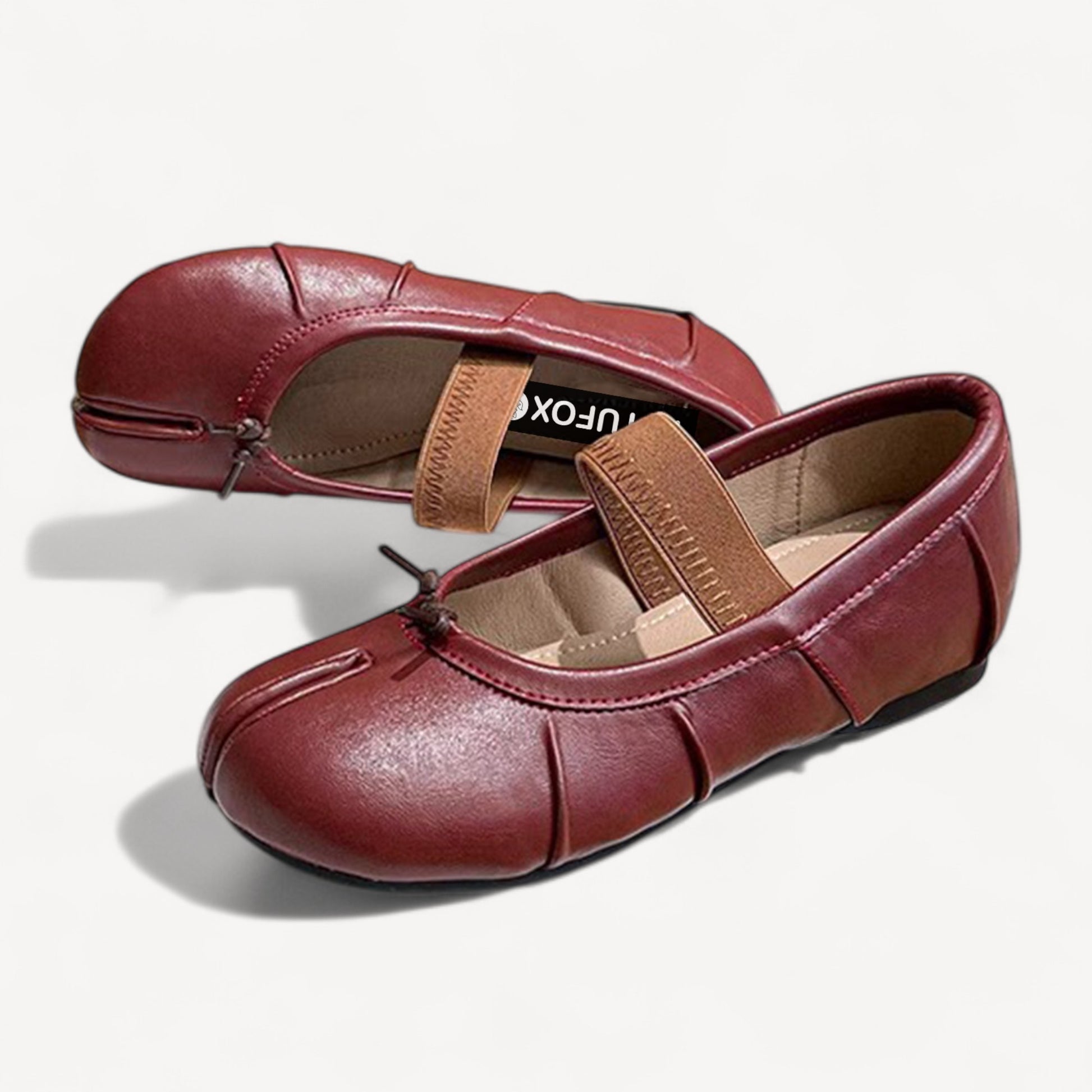 Soft burgundy leather meets subtle elegance. These hidden-wedge split-toe shoes feature a central elastic strap for secure fit and gentle lift, perfect for all-day wear.