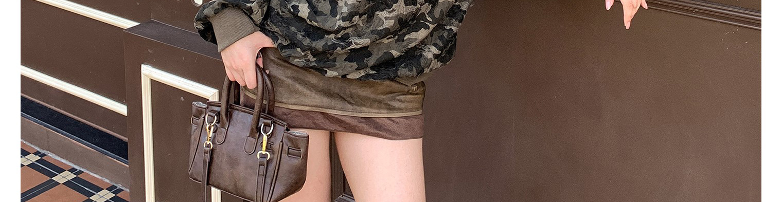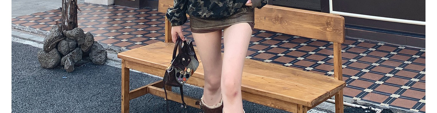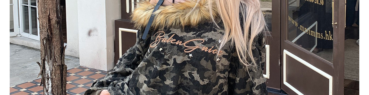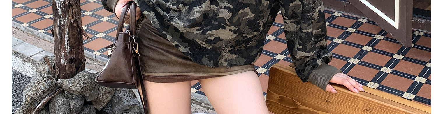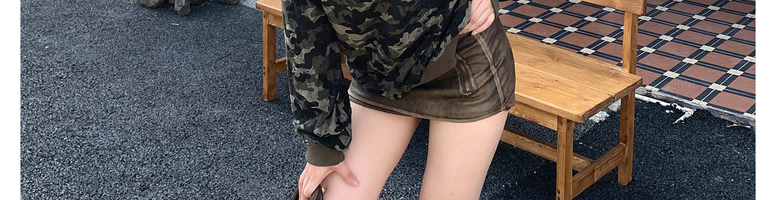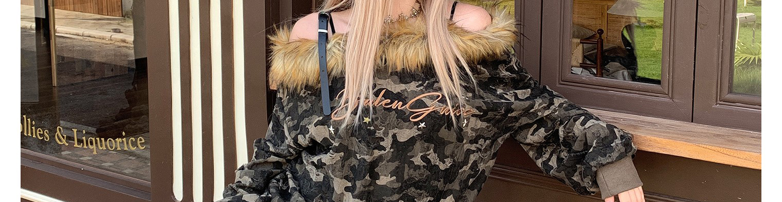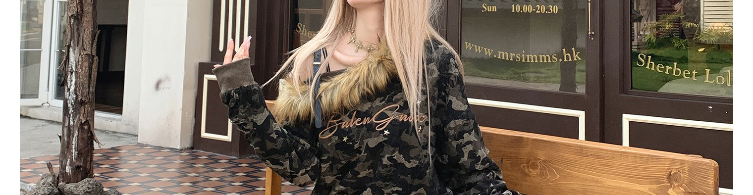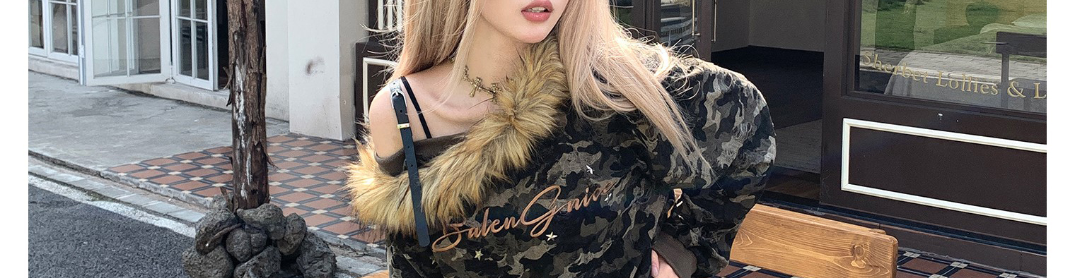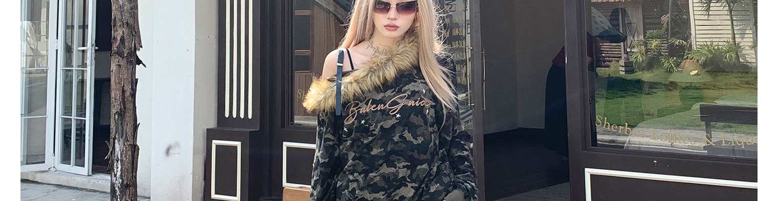 Street-style camo sweatshirt with off-shoulder design and detachable fur collar. Loose fit for a bold Y2K look.