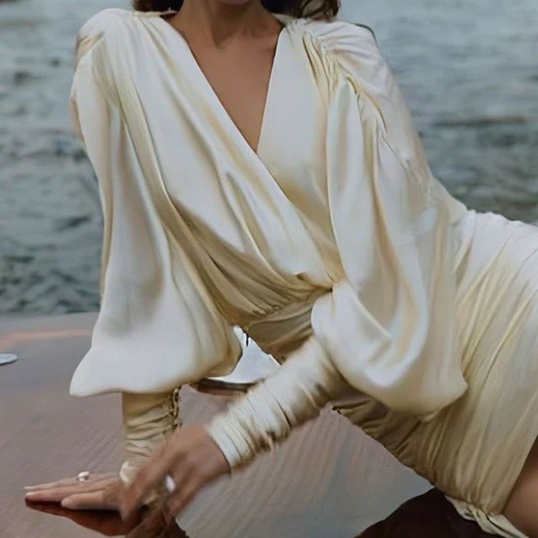 - High-end champagne satin gown dress with slim-fit silhouette. Elegant and luxurious, perfect for gala dinners or formal events.