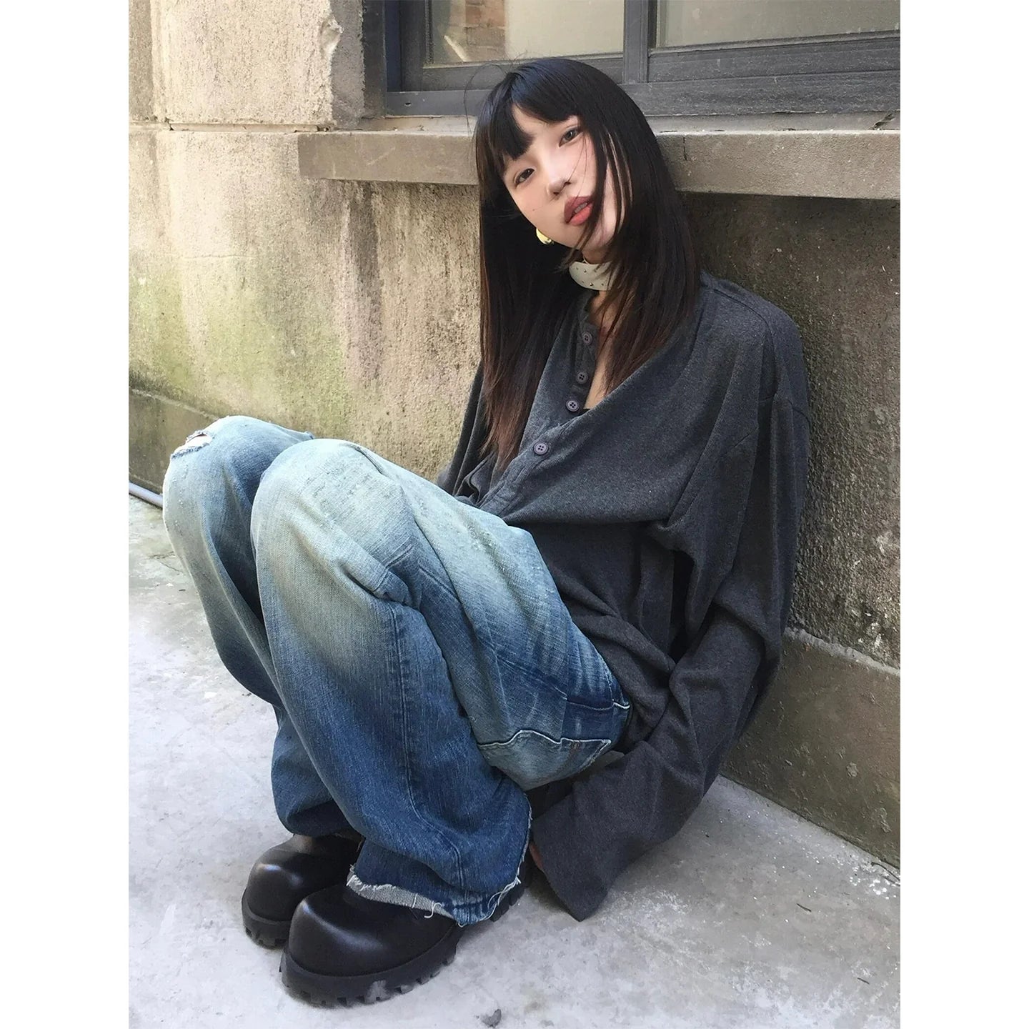 Cleanfit Henley Long Sleeve Tee Early Autumn Loose Comfortable Base Top