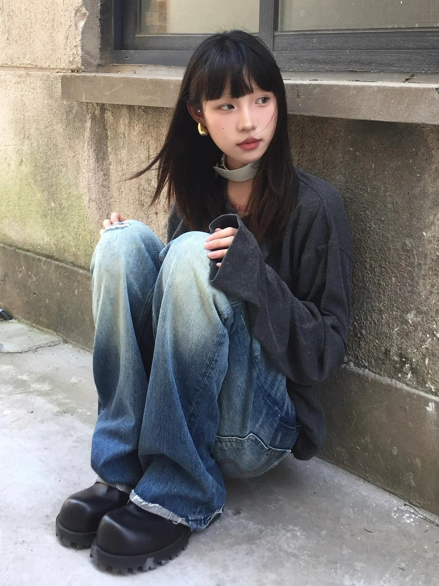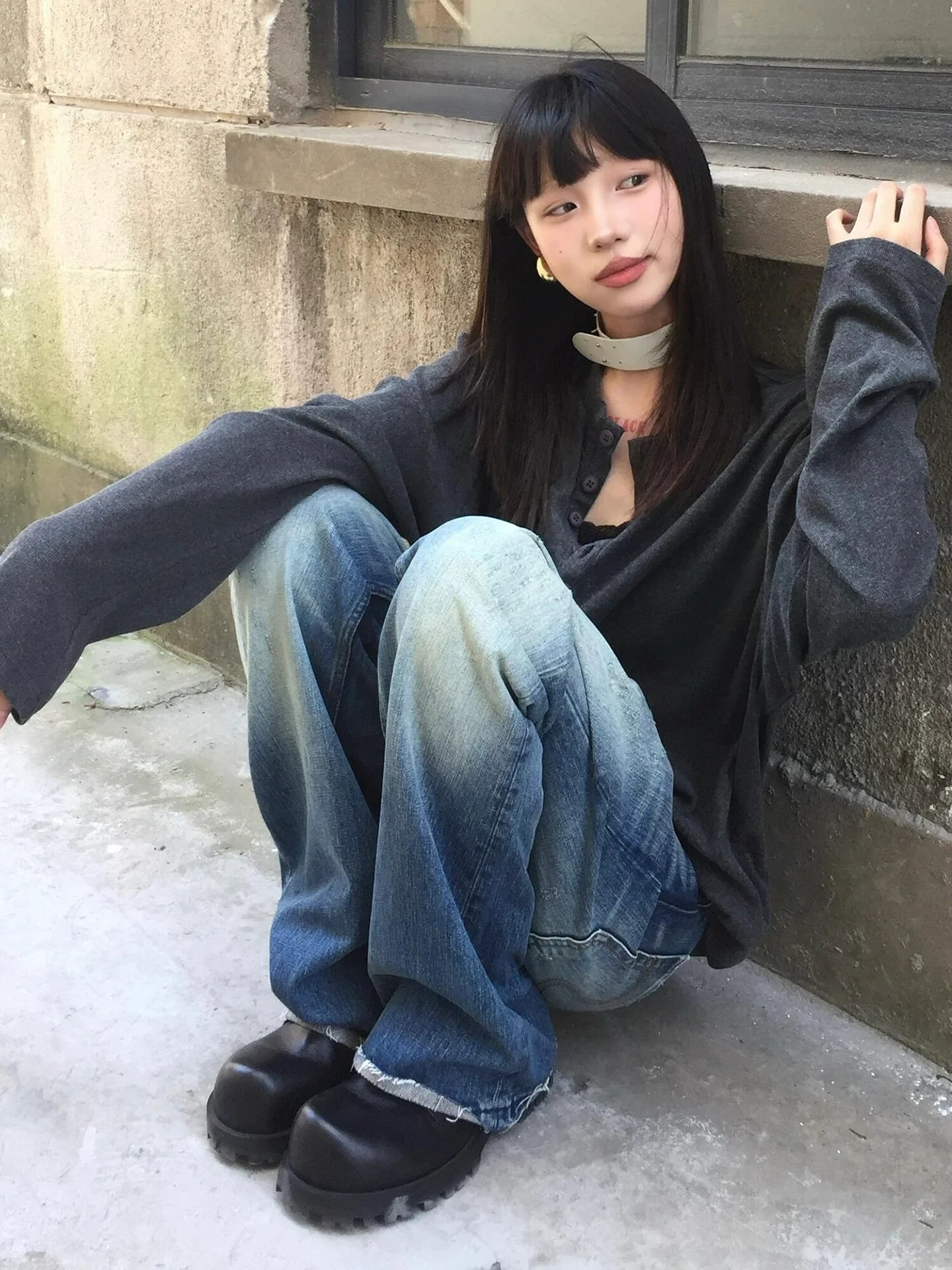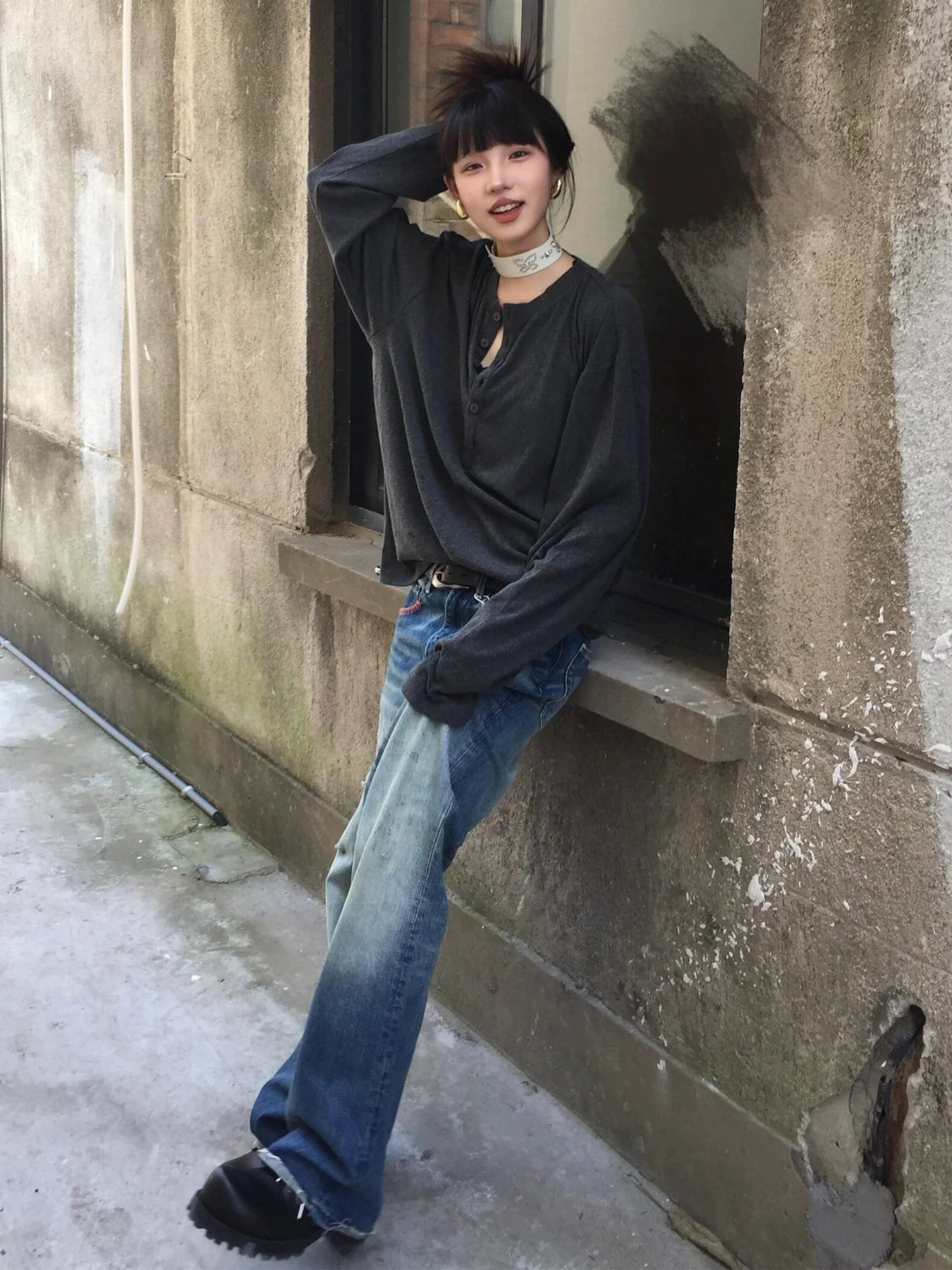 - Top: Early autumn Henley long sleeve tee, loose comfortable fit, soft cotton fabric, cleanfit old money aesthetic, casual versatile base top.