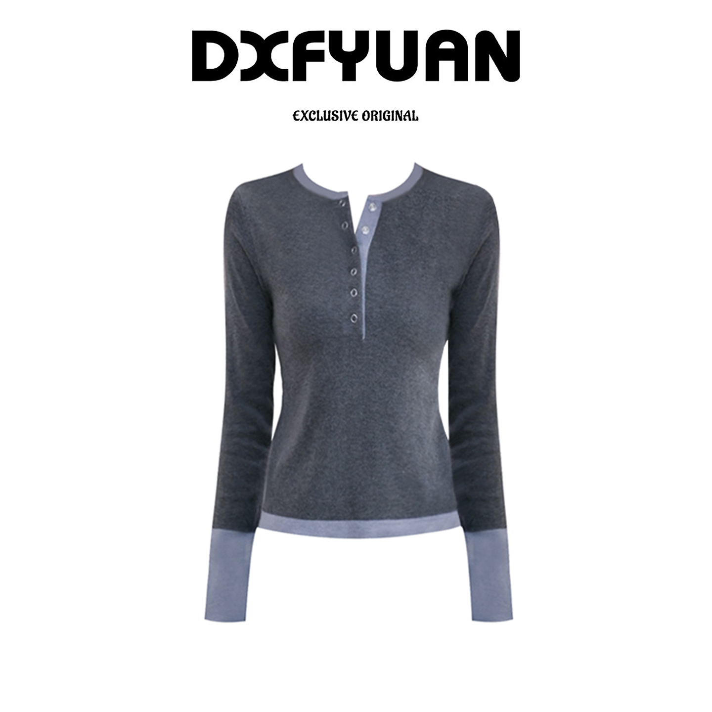 Henley collar layered knit top with colorblock patch. Slim fit, spicy girl style for early autumn.