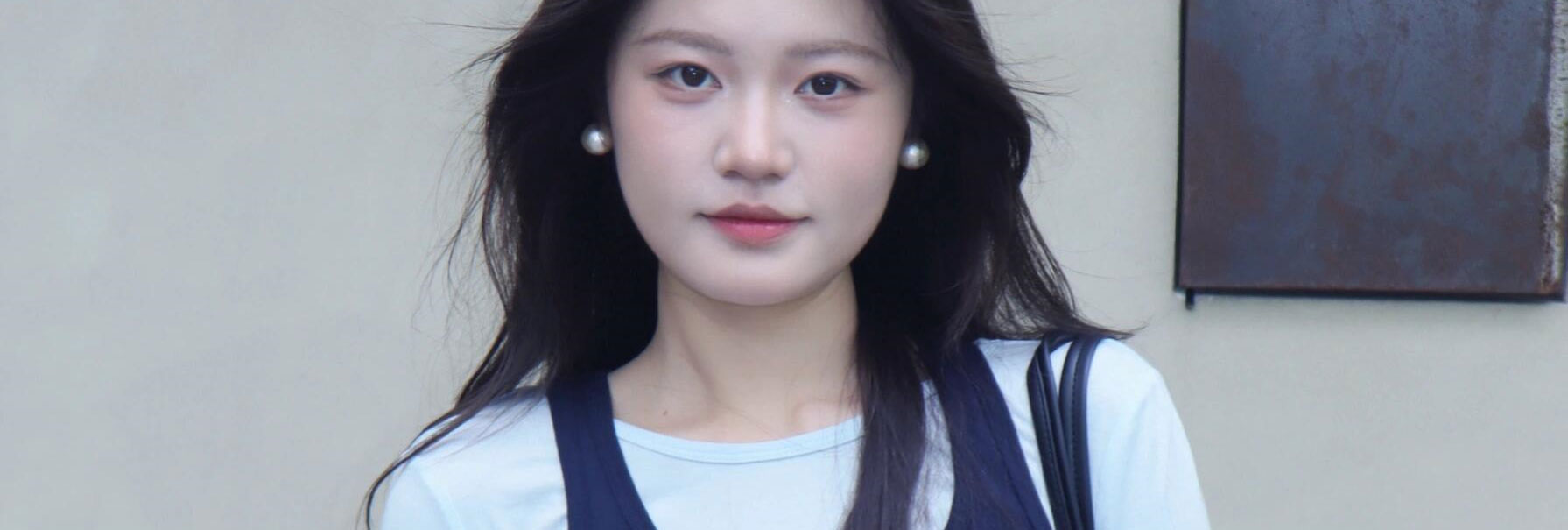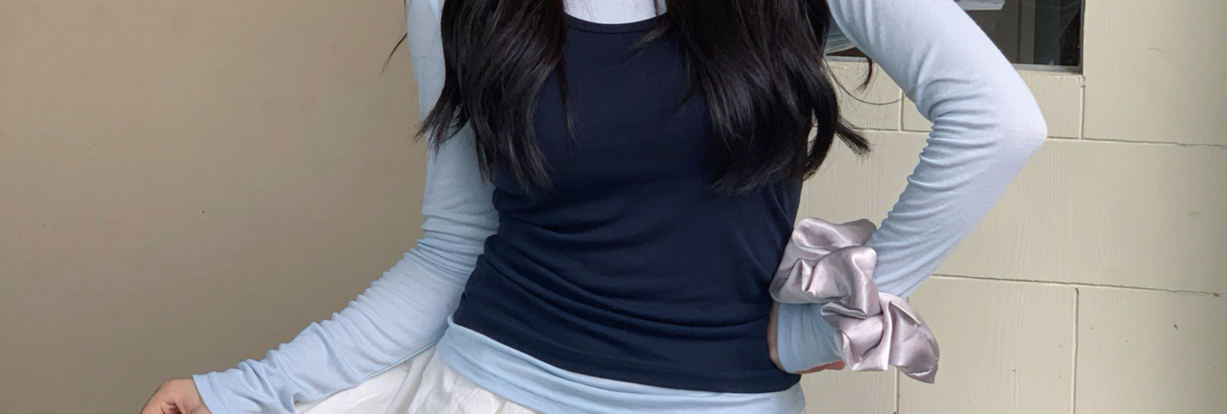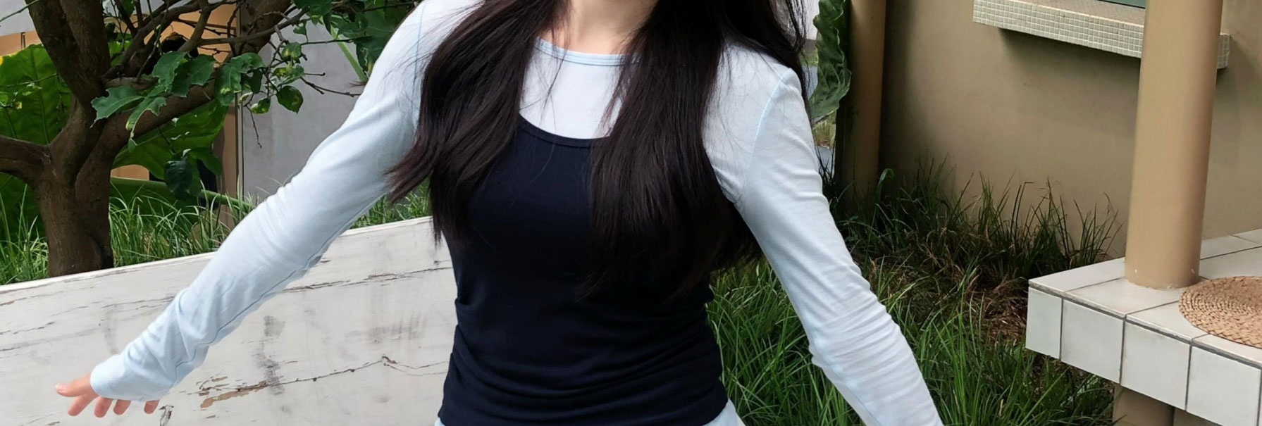 Coree-style layered tee with colorblock vest overlay. Slim-fit and chic, offering unique early-fall style.