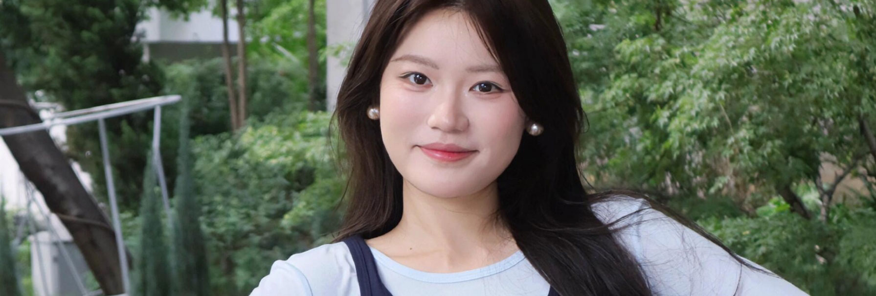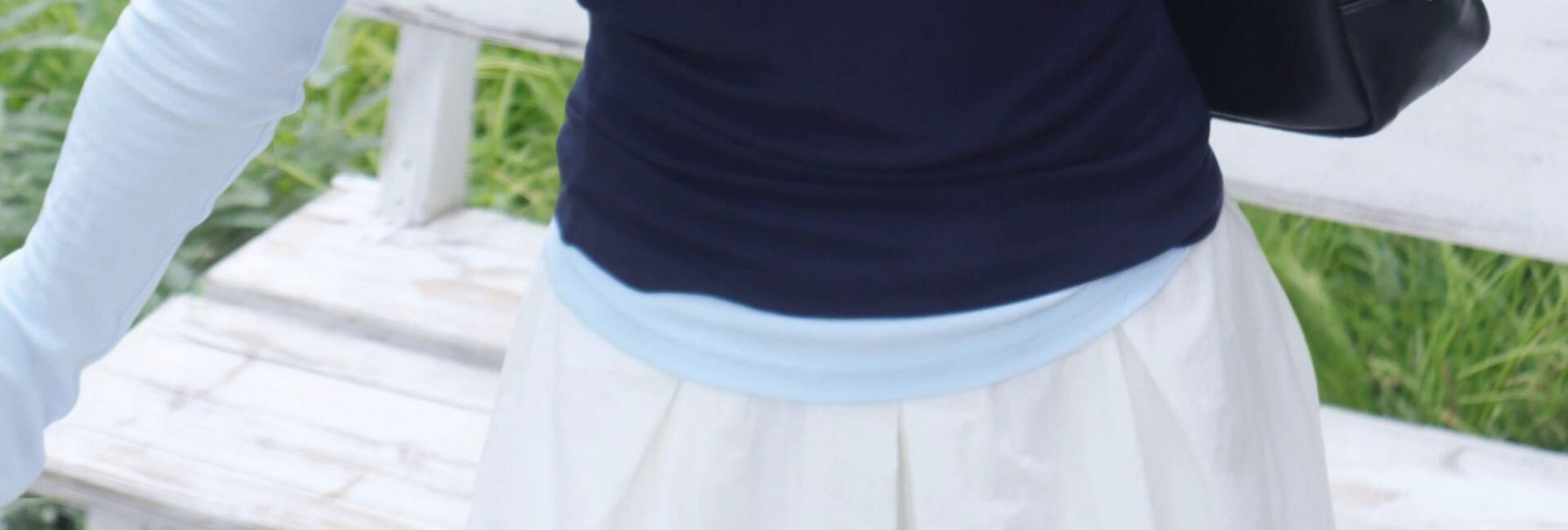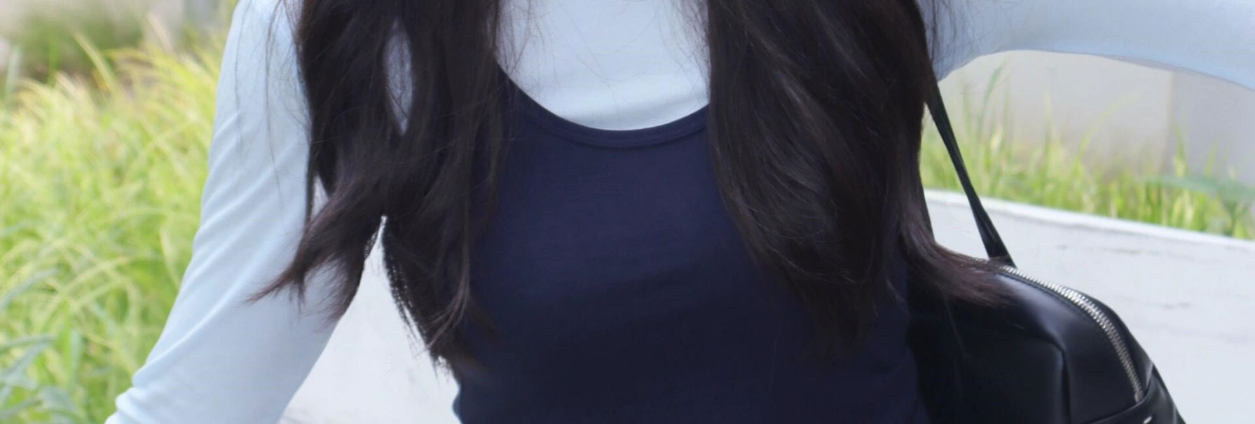 Coree-style layered tee with colorblock vest overlay. Slim-fit and chic, offering unique early-fall style.