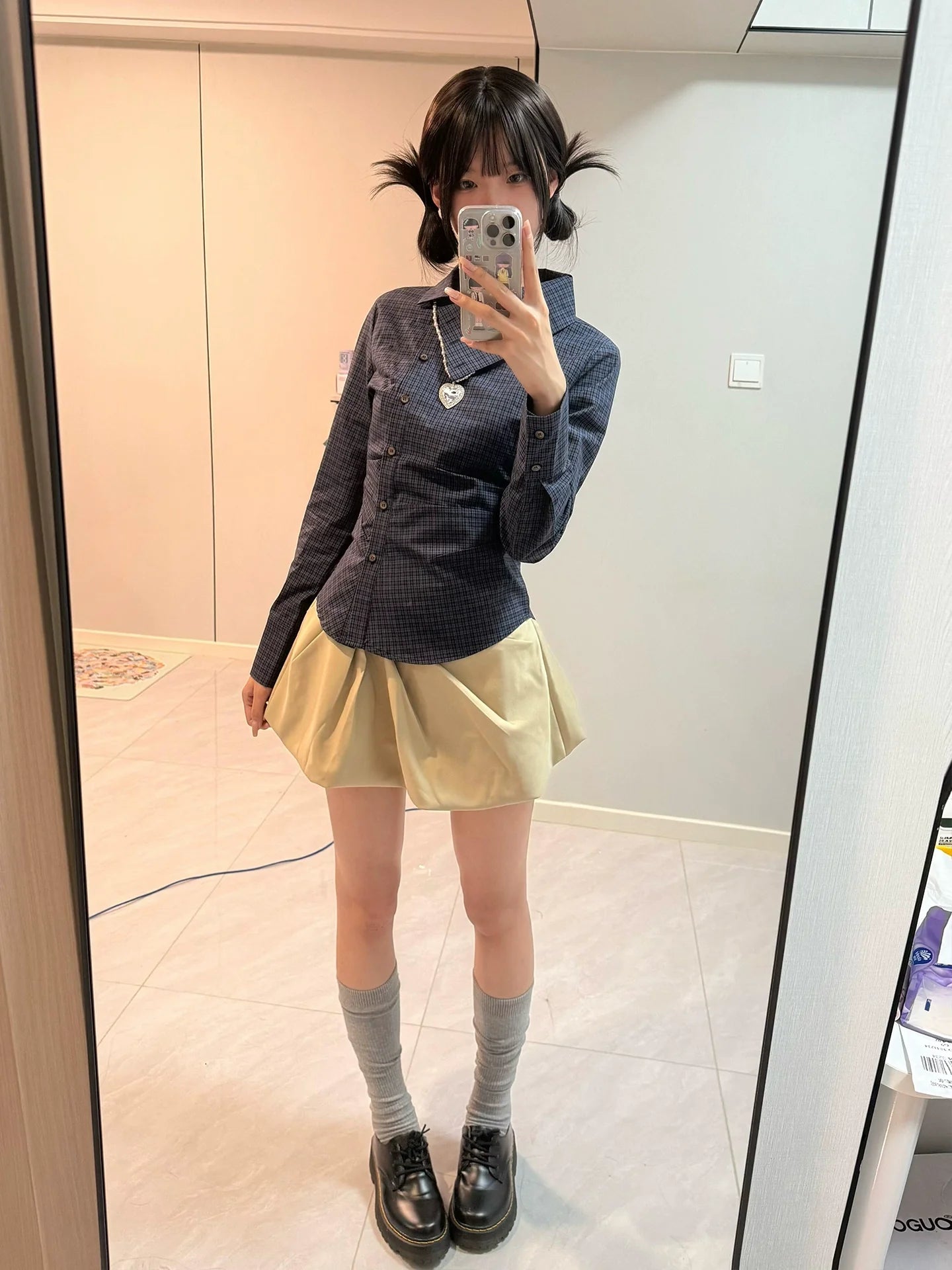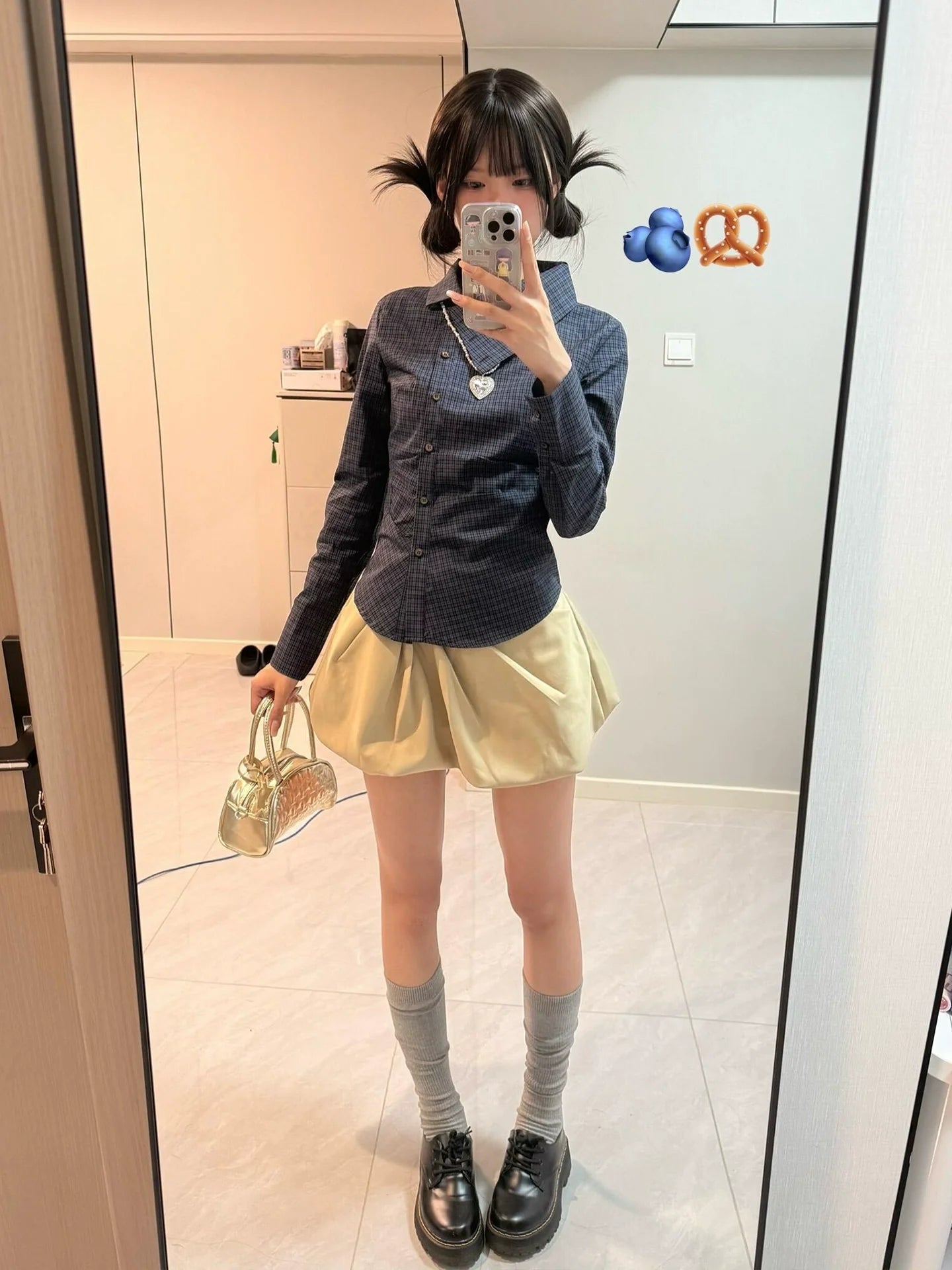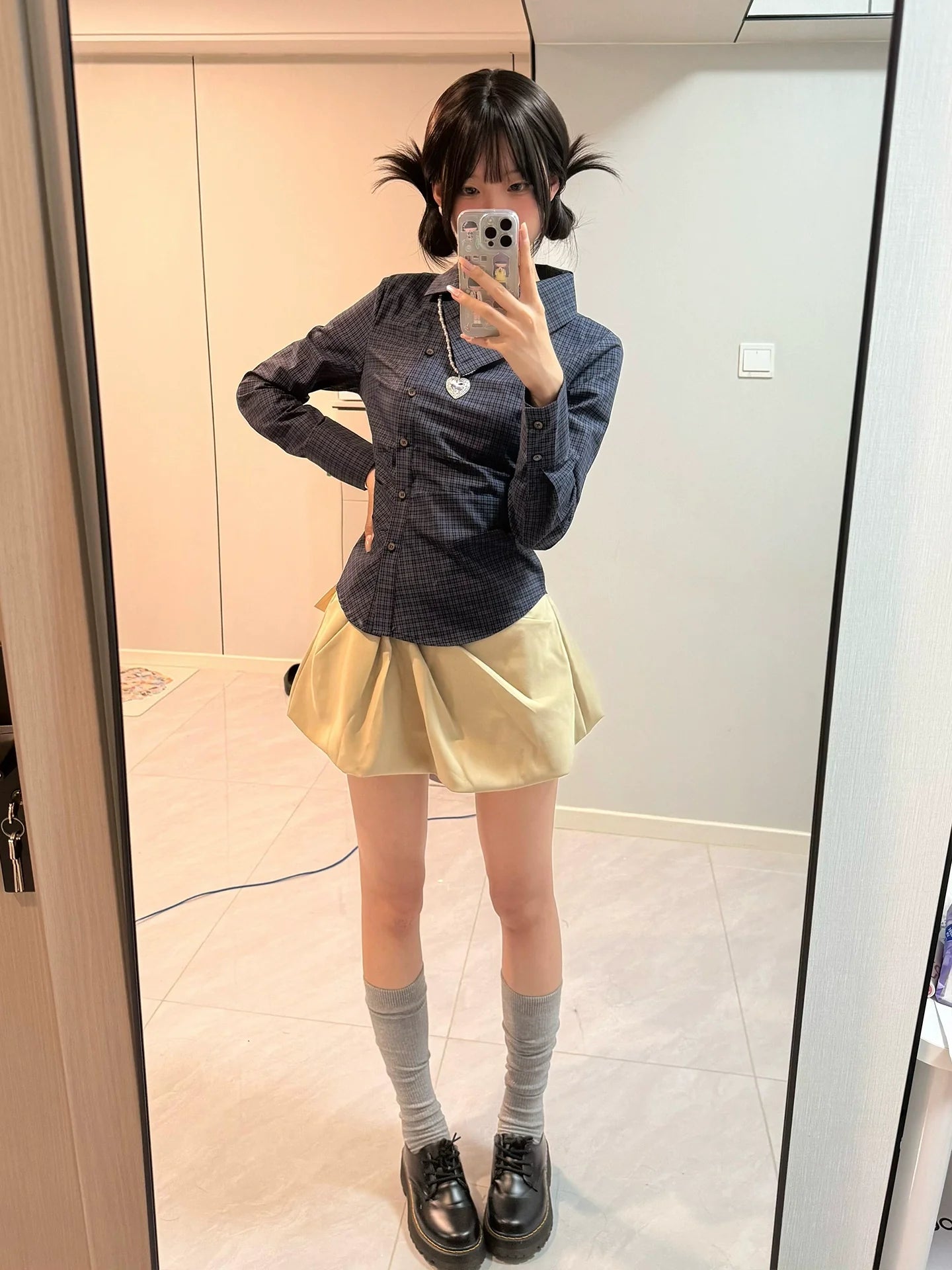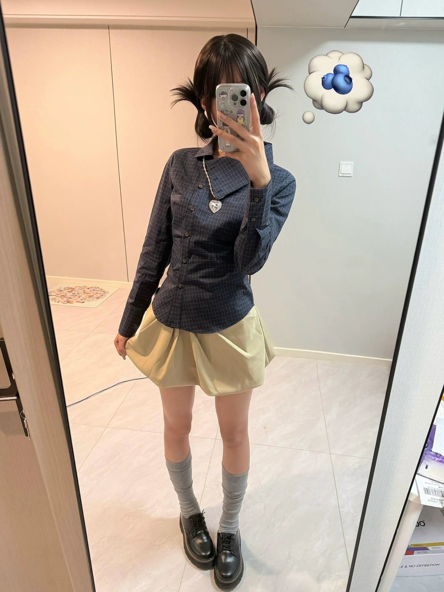 - Top: Plaid long sleeve shirt with asymmetrical collar and slim waist, retro academic design.