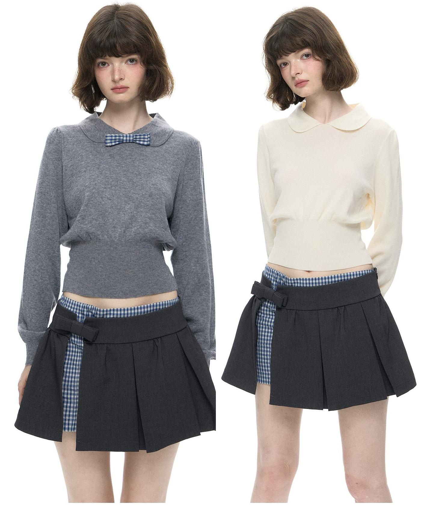 - Top: Cropped knit sweater with doll collar, slim-fit waist, soft early autumn fabric.