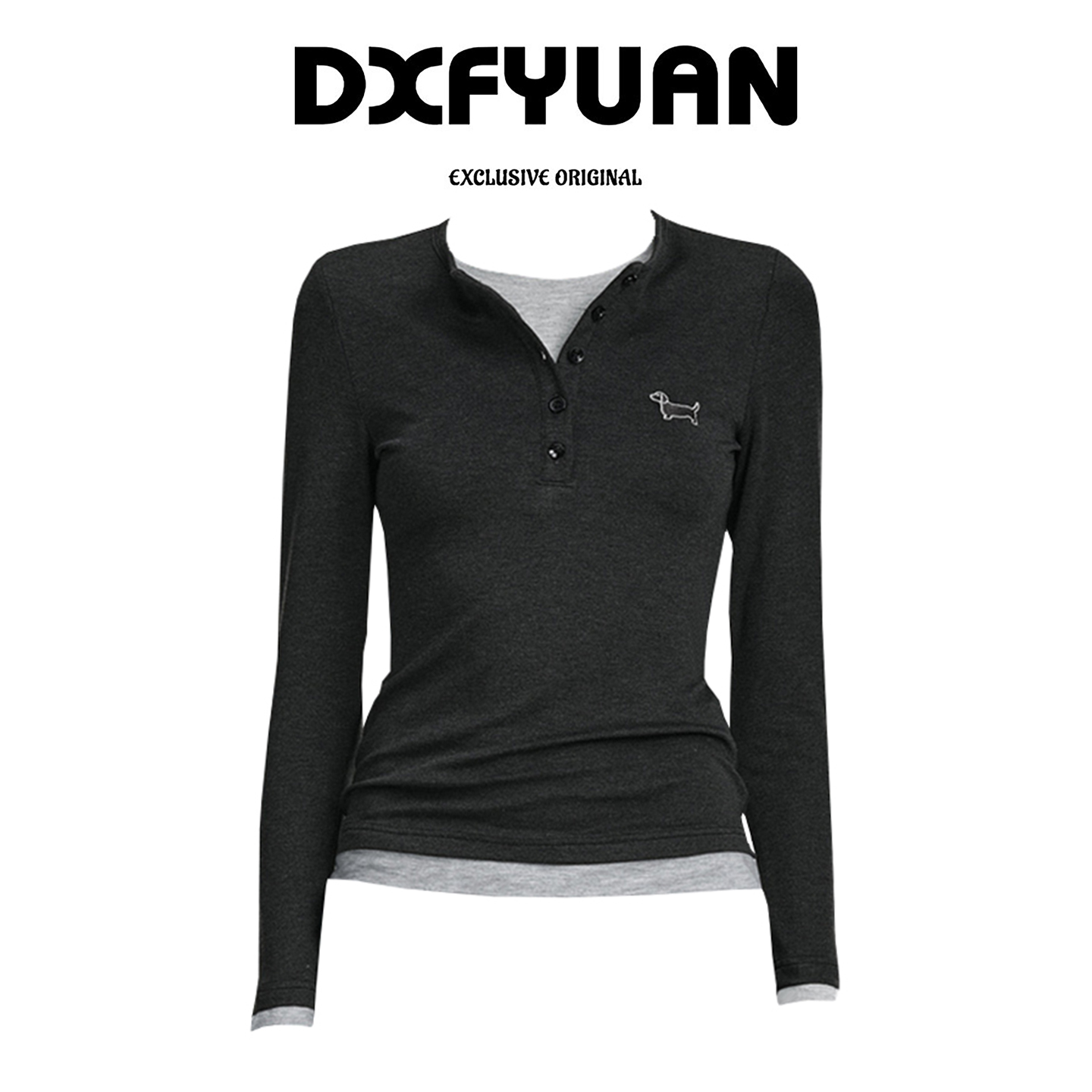 - Top: Long sleeve Henley with faux layered design, color block details, slim fit.