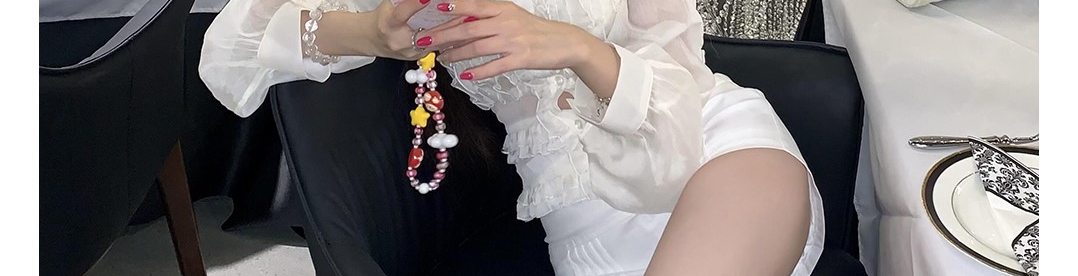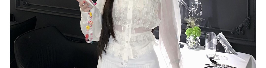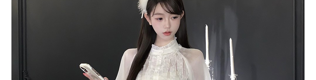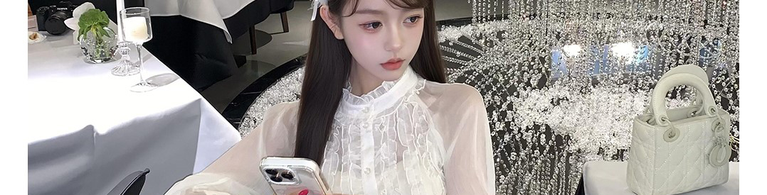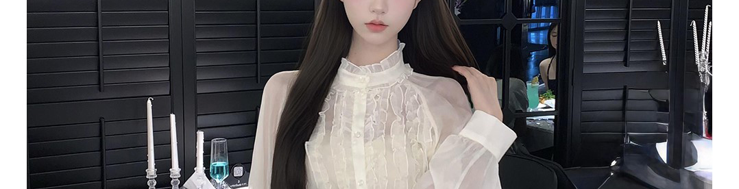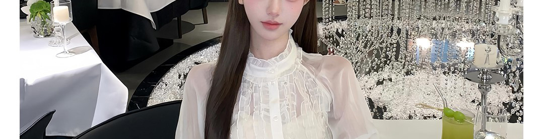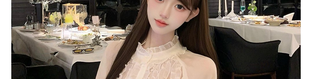 - Top: Slim-fit long-sleeve chiffon blouse with high collar and waist-defining cut, soft autumn fabric.