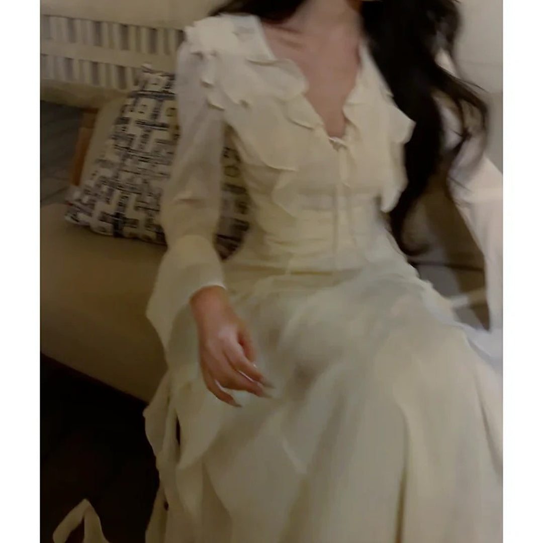 French Fairy V Neck Long Sleeve Ruffle Mermaid Gown Dress