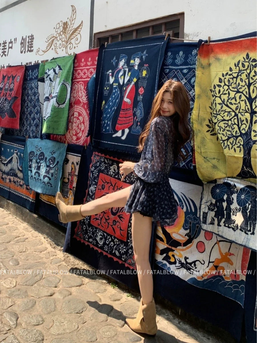 French Floral V-Neck Chiffon Long-Sleeve Waist-Cinched Mini Dress