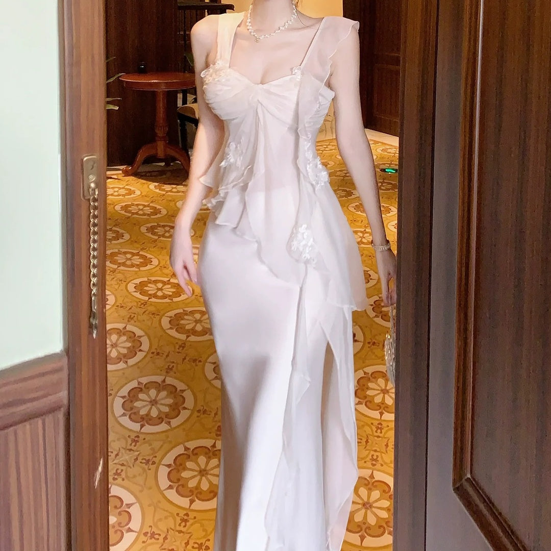 French two-piece gown set with lace floral asymmetrical top and fitted satin mermaid skirt. Elegant for weddings, parties, or evening events.