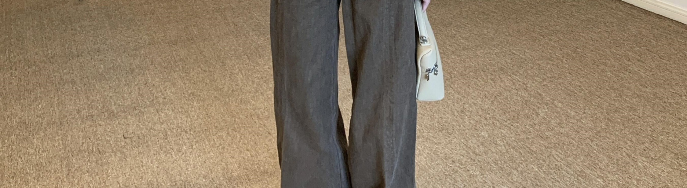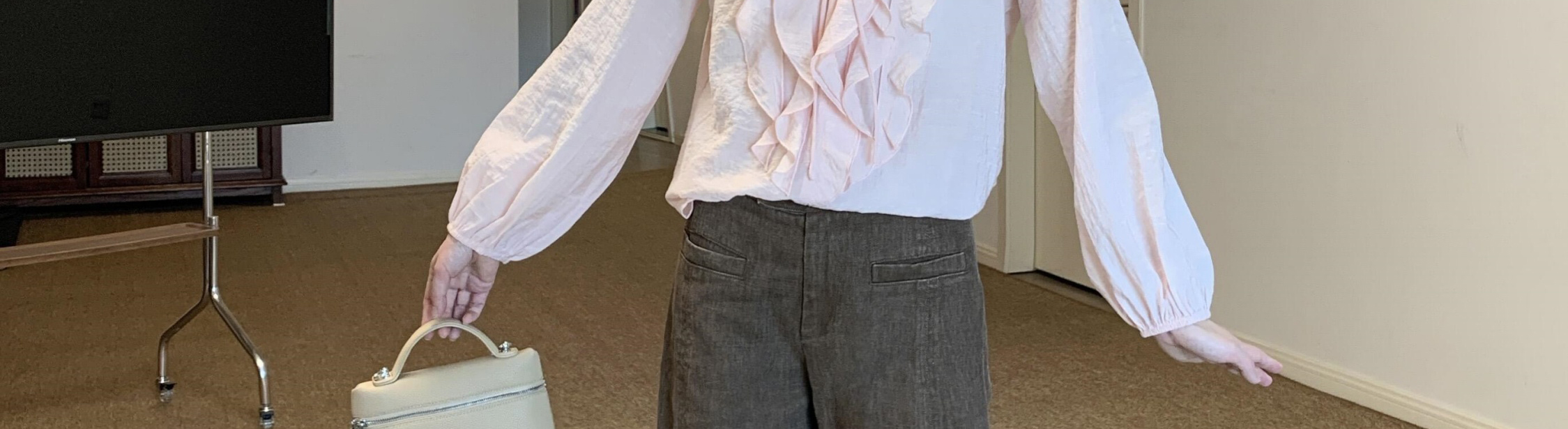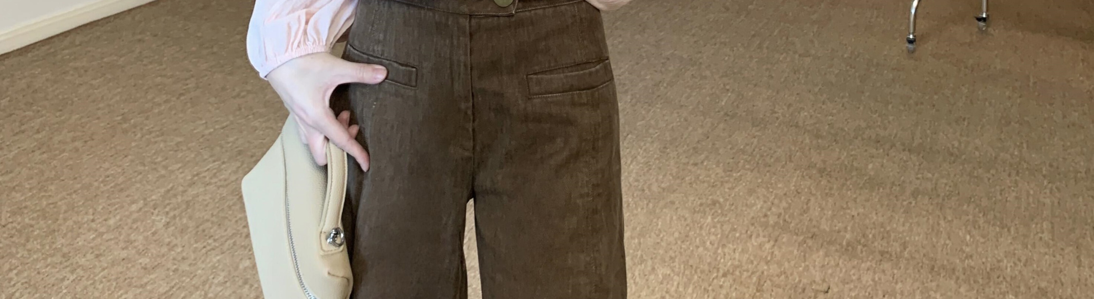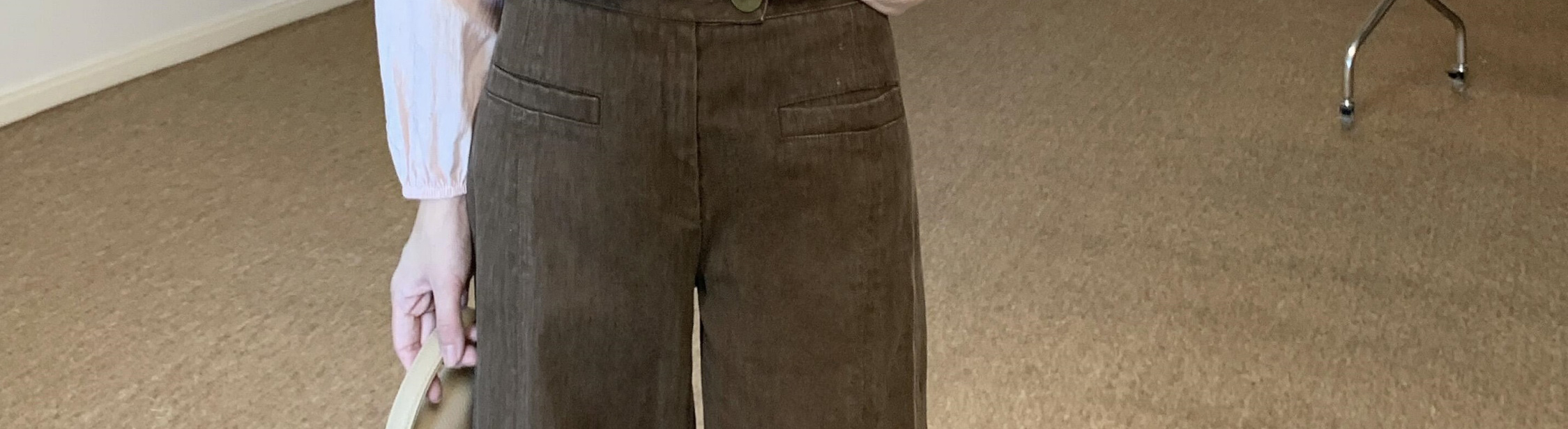 - Top: Loose-fit V-neck blouse with lotus edge detailing, soft autumn fabric, elegant and breathable long sleeves.
